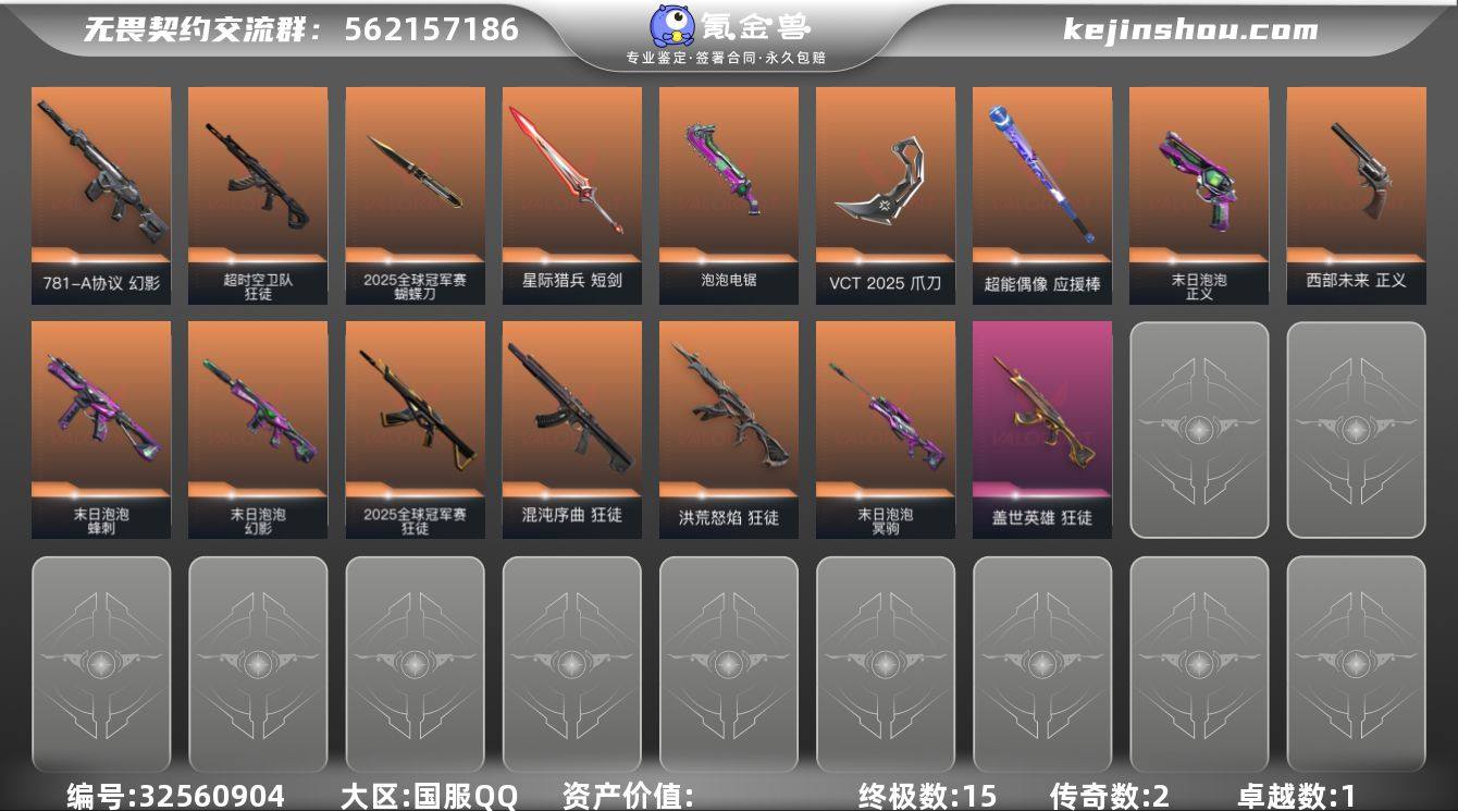 【编号75591 可秒换绑】【店长推荐25冠军套极品号!直接毕业不用再充一分钱!!!】 【套装】:2025全球冠军赛套装,末日泡泡套装,VCT 2025 赛季套装 【英雄】:幻棱,炼狱,维斯,暮蝶,钛狐,壹决,铁臂,捷风,雷兹,幽影,不死鸟,贤者,猎枭,蝰蛇,零,芮娜,奇乐,尚勃勒,霓虹,斯凯,夜露,星礈,K/O,海神,盖可,黑梦,钢锁 【近战武器】:近战武器-2025全球冠军赛 蝴蝶刀,近战武器-泡泡电锯,近战武器-VCT 2025 爪刀,近战武器-鬼丸国纲,近战武器-超能偶像 应援棒,近战武器-生物分子解离器,近战武器-星际猎兵 短剑 【狂徒】:狂徒-2025全球冠军赛,狂徒-洪荒怒焰,狂徒-混沌序曲,狂徒-超时空卫队,狂徒-盖世英雄,狂徒-超能偶像 【幻影】:幻影-末日泡泡,幻影-781-A协议,幻影-聚合之力 【戍卫】:戍卫-超能偶像 【獠犬】:獠犬-采蜜小蜂队 【冥驹】:冥驹-末日泡泡 【飞将】:飞将-聚合之力 【战神】:战神-采蜜小蜂队 【判官】:判官-超能偶像,判官-采蜜小蜂队 【骇灵】:骇灵-无限竞技 【蜂刺】:蜂刺-末日泡泡,蜂刺-聚合之力 【标配】:标配-超能偶像 【正义】:正义-西部未来,正义-末日泡泡,正义-超限闪存,正义-纳米打击 【鬼魅】:鬼魅-诡秘蛇...
