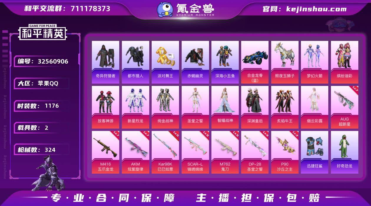 【特价出售】苹果Q-7稀有3载具10粉装10特效枪35热门292套装324枪皮 107081热力值 19印记 历史绝世王牌16星 【7稀有】 奇异狩猎者 赤蝎幽灵 AKM-缤纷海域 都市猎人 浪漫天命 派对舞王 派对舞王(金靴子) 【3载具】 合金龙骨蓝色 照夜玉狮子 萌兔起飞僚机 【10粉装】 圣堂之誓 梦幻火箭 烟云彩露 深渊皇后 智耀战神 缤纷油彩 放客神游 新星烈龙 绚金战神 炙焰牛王 【10特效枪】 M416-五爪金龙 (7级) SCAR-L-锦绣绵绵 (5级) P90-沙丘之主 (3级) AKM-炫紫旋律 (7级) Kar98K-巳巳如意 (5级) M762-鬼刀 (5级) AUG-超新星 (7级) DP-28-圣堂之誓 (4级) Mk14-福马献瑞 (5级) UMP45-萌骑冒险 (5级) 【35热门】 小丑鱼 奇迹天团 龟仙人 暗夜之虎 萌神柯基 仓鼠灰灰 雪山精英 梦魇先生 呆萌铁蟹 万圣娃娃 鹰眼刺客 好奇恐龙 奇迹天团 激萌罗小黑 暗夜之虎 迅捷狂鲨 深海小丑鱼 金羽特工 暗影哥特 SS1特训 团圆交子 瑞龙福将 星河浪客 狂沙舞者 漫步者 冰爽海盐 破蛋小黄鸡 风华少年志 黑色刀锋 极速红龙 弄潮海豚 M416-仓鼠灰灰 AKM-奇异狩猎者 M762-瑞龙福将 M24-奇异狩猎者 【3飞行器】 梦幻火箭飞行器 春暖花开飞行器 镜光幻境飞行翼 【6头盔】 九霄头盔 精灵迷巫头盔 梦幻火箭头盔 甜...