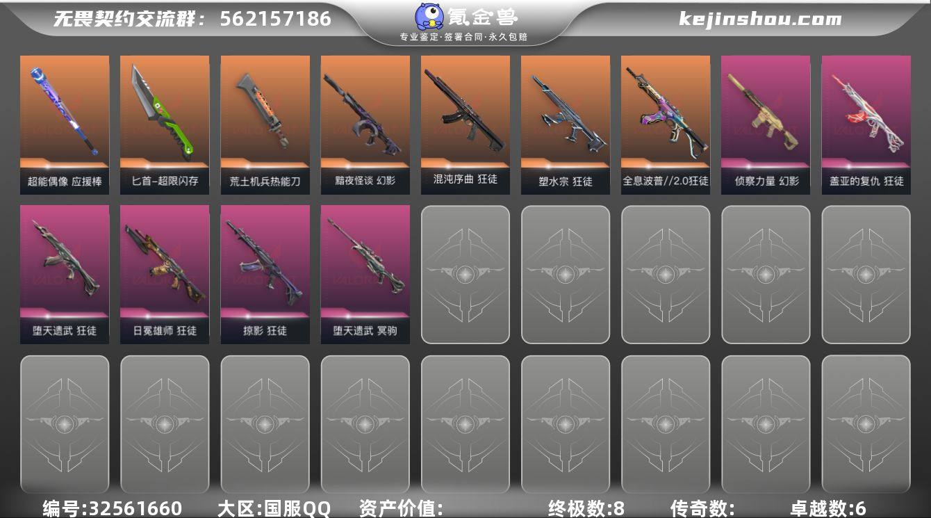 【编号30960 可秒换绑 店长推荐捡漏号!】【英雄】:幻棱,炼狱,维斯,暮蝶,钛狐,壹决,铁臂,捷风,雷兹,幽影,不死鸟,贤者,猎枭,蝰蛇,零,芮娜,奇乐,尚勃勒,霓虹,斯凯,夜露,星礈,K/O,海神,盖可,黑梦,钢锁 【近战 武器】:近战武器-剥皮小刀,近战武器-超能偶像 应援棒,近战武器-超限闪存 匕首,近战武器-荒土机兵 热能刀 【狂徒】:狂徒-混沌序曲,狂徒-全息波普//2.0,狂徒-塑水宗,狂徒-堕天遗武,狂徒-掠影,狂徒-盖亚的复仇,狂徒-日冕雄师,狂徒-超能偶像,狂徒-荒土机兵 【幻影】:幻影-黯夜怪谈,幻影-侦察力量,幻影-超限闪存,幻影-聚合之力,幻影-纳米打击 【戍卫】:戍卫-超能偶像,戍卫-浮光跃金,戍卫-逆冲蛮牛 【獠犬】:獠犬-采蜜小蜂队,獠犬-模拟赫兹,獠犬-逆冲蛮牛 【冥驹】:冥驹-堕天遗武,冥驹-荒土机兵,冥驹-模拟赫兹 【飞将】:飞将-聚合之力 【莽侠】:莽侠-超限闪存 【战神】:战神-采蜜小蜂队,战神-浮光跃金 【奥丁】:奥丁-纳米打击 【判官】:判官-超能偶像,判官-采蜜小蜂队,判官-纳米打击x 【雄鹿】:雄鹿-模拟赫兹,雄鹿-逆冲蛮牛 【骇灵】:骇灵-荒土机兵,骇灵-浮光跃金 【蜂刺】:蜂刺-超限闪存,蜂刺-聚合之力...