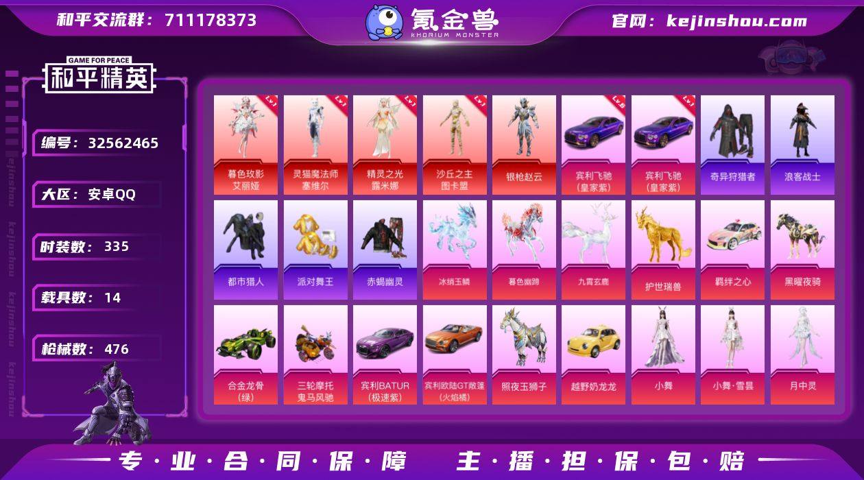 可二次【5红装33粉装31特效枪14载具 可秒换绑不用等】 安卓Q区-188641热力值-335套装-476枪皮 【5红装】 精灵之光-露米娜(1级) 角色-银枪赵云(1级) 沙丘之主-图卡盟(1级) 暮色玫影-艾丽娅(1级) 灵猫魔法师-塞维尔(4级)【15载具】 合金龙骨绿色 僚机-萌兔起飞 鬼马风驰 宾利飞驰(皇家紫)(2级) 宾利BATTUR(极速紫) 照夜玉狮子 宾利欧陆GT敞篷(火焰橘) 暮色幽蹄 九霄玄鹿 霜月冰狼 越野奶龙龙 羁绊之心 黑曜夜骑 冰绡玉鳞 护世瑞兽【8稀有】 8号机 Mark.06 奇异狩猎者 赤蝎幽灵 派对舞王 浪客战士 都市猎人 派对舞王(金靴子)【33粉装】 黄螳螂 梦幻火箭 宝贝奶油派 圣堂之誓 彩虹甜喵 玩偶服-猪猪侠 新星烈龙(小白龙) 小可学妹 香水柠檬 星云暗核 冰川粉黛 冰川红玫 恐龙拽拽 放客神游 人物-小舞·灵珑 人物-小舞·雪昙 月中灵 人物-小舞·恋语 俏雪含霜 吟月归客 碧影闪光 呆萌星弥 玉鳞金羽 极限特训 未来战士 冰川幽秘 诡面斩 星穹咏叹调 角色-狂魅哈莉 角色-鸢尾晶梦 角色-罗征 角色-千金淑猫 角色-羊梦糖心【30特效枪】 SCAR-L-青春物语(1级) AWM-璀璨巨星(4级) DP-28-圣堂之誓(1级) M416-五爪金龙(1级) AKM-星际浪客(1级) P90-沙丘之主(3级) MG3-梦幻舞会(4级) GROZA-香...