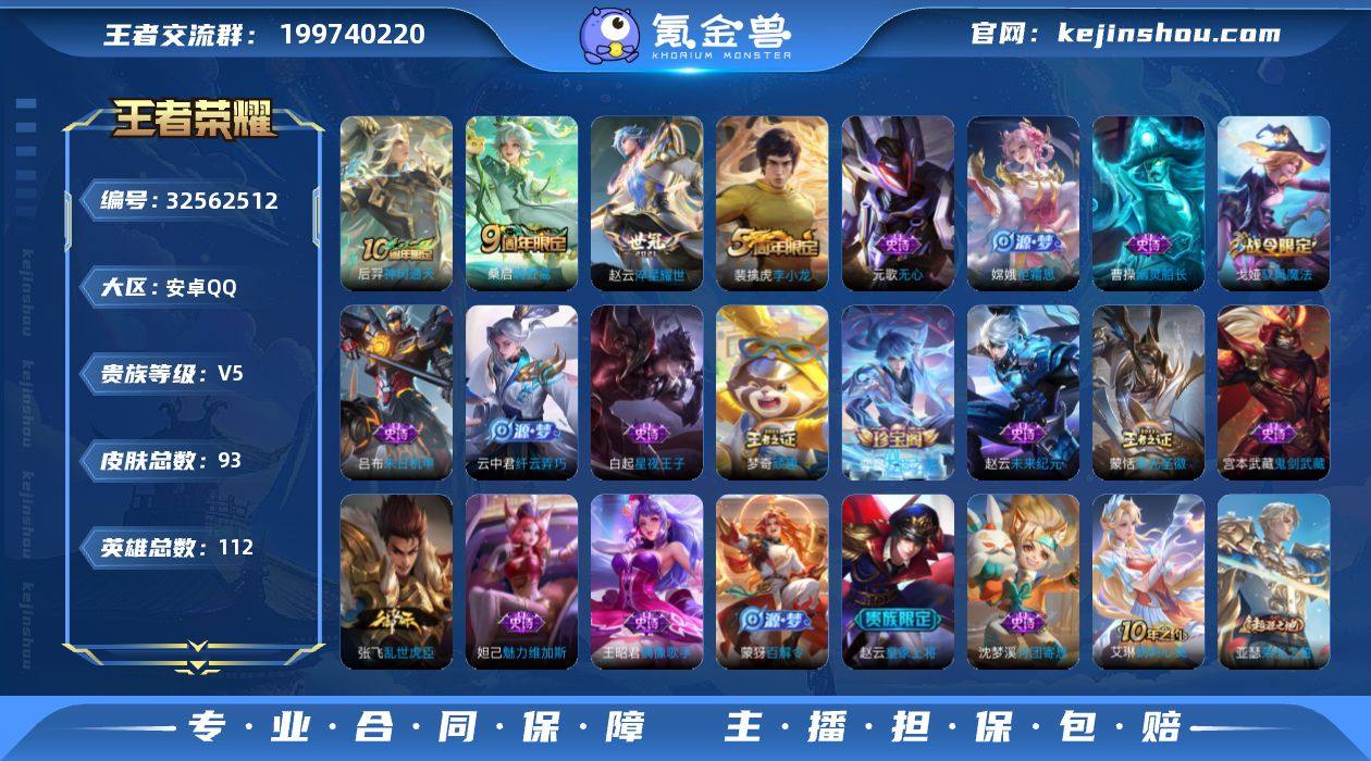 【93皮肤3传说 可秒换绑不用等】安卓Q-112英雄【3传说】神树通天 鸣野蒿 淬星耀世【19史诗】百解令 荣光圣徽 万物之道 顽趣 驭风魔法 幽灵船长 拒霜思 魅力维加斯 鬼剑武藏 末日机甲 李小龙 月团寄思 偶像歌手 纤云弄巧 乱世虎臣 皇家上将 无心 未来纪元 星夜王子【43勇者】鹤鸣心笺 劲辣红锅 完美运算 古海寻踪 幻夜行动 西部游侠 剑破天穹 探海日志 玲珑珍味 云中旅人 命运角斗场 零食大作战 流音漫舞 金庭之子 破局者 王牌新星 暖冬絮语 时空谍影 雾都夜雨 荣光之誓 龙腾万里 教廷特使 兔女郎 特工战影 功夫老勺 敏锐之力 万事如意 哥特玫瑰 乓乓大师 黑桃队长 野性能量 海滩派对 丁香结 死亡骑士 五福同心 忍·炎影 海滩丽影 掌控之力 擒涛扼浪 潮玩造梦师 大漠名商 潮玩探月行 阴阳师【7稀有英雄】嬴政 不知火舞 橘右京 夏洛特 娜可露露 韩信 艾琳 赵云 营地ID:1806964092