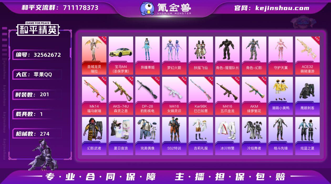【女号3级龙妈 1红装5粉装8特效枪1载具 可秒换绑不用等】 苹果Q区-88051热力值-201套装-274枪皮 【1红装】 圣域龙灵-瑞拉(3级)【1载具】 宝马M4(圣保罗黄)【3稀有】 Mark.06 M416-黄金龙骨 AWM-黄金龙骨【5粉装】 梦幻火箭 扶摇飞仙 猩猩队长 角色-守护天翼 角色-异瞳寒姬【8特效枪】 M416-五爪金龙(7级) AKM-绿萝繁花(5级) Mk14-福马献瑞(5级) AKS-74U-森灵之息(5级) ACE32-萌骑漫游(4级) Kar98K-巳巳如意(5级) DP-28-豹影疾电(5级) M416-女娲灵识(3级)【54热门】 M416-蓝色火焰 GROZA-异彩先驱 GROZA-彩虹符号 长空猛禽 异彩先驱 虚音幻奏 甜心亚梦 甜蜜熊情侣 牛气冲天 霓虹极客 妙红点点 懵萌河马 浪漫天命 雪山精英(老6服) 潮萌小黄鸭 鹰眼刺客 破蛋小黄鸡 金羽特工 暗夜契约 暗影哥特(红眼罩) 团圆交子 瑞龙福将 纯白誓言 SS9特训 SS8特训 SS6特训 SS27特训 SS26特训 SS25特训 SS24特训 SS23特训 SS22特训 SS10特训 Mini14-梦幻火箭 Mark.06 AWM-不夜海上花 M416-乌木金纹 GROZA-乌木金纹 SCAR-L-玉兔迎春 GROZA-田园牧歌 M762-天降萌叽 Mk47-乌木金纹 SKS-糯团青竹 UZI-娇憨猪猪 M416-夜灯 UMP45-蓝色火焰 DBS-彩虹符号 M249-彩虹符号 MG3-幻世战舞者 AKM-虎虎生威 AKM...