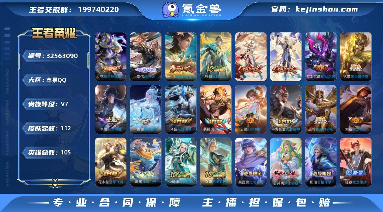 不可二次 苹果Q-V7-最强王者段位-105英雄-112皮肤-1典藏皮肤-1无双-15传说-26史诗 QW2632107 【英雄全皮】:孙权全皮 【荣耀典藏】:铠银白咏叹调 【无双皮肤】:李信问心剑 【传说皮肤】:狄仁杰神骥赴朔漠,杨戬纵目迁山,司空震愿照山河定,澜愿照九州拓,云缨幻光神枪,裴擒虎祥瑞亨通,露娜霜月吟,马超无双飞将,李信一念神魔,刘备时之恋人,干将莫邪久胜战神,达摩黄金狮子座,花木兰冠军飞将,后羿黄金射手座,宫本武藏地狱之眼 【限定皮肤】:狄仁杰阴阳师,赵云皇家上将,元歌云间偶戏,狄仁杰魔术师,项羽海滩派对,孙悟空至尊宝,李元芳云中旅人,杨戬潮玩骑兵,雅典娜单词大作战,沈梦溪大漠名商,鲁班大师探海日志,沈梦溪龙舞盛年 【年限皮肤】:司空震愿照山河定,澜愿照九州拓 【赛季限定】:沈梦溪大漠名商,李元芳云中旅人,鲁班大师探海日志,太乙真人谧流熔炉,钟馗虚灵犬护,甄姬逆浪荇歌,亚瑟荣光之誓 【战令限定】:雅典娜单词大作战,元歌云间偶戏,杨戬潮玩骑兵,孙膑茶境仙,马超访茗客,刘禅鸭鸭历险记,沈梦溪鸭鸭历险记,周瑜百相守梦,孙策百相守梦,莱西奥光弋星穹,明世隐往忆晖光,周瑜线条小狗 【史诗皮肤】:周瑜线条小狗,少司缘巫礼...