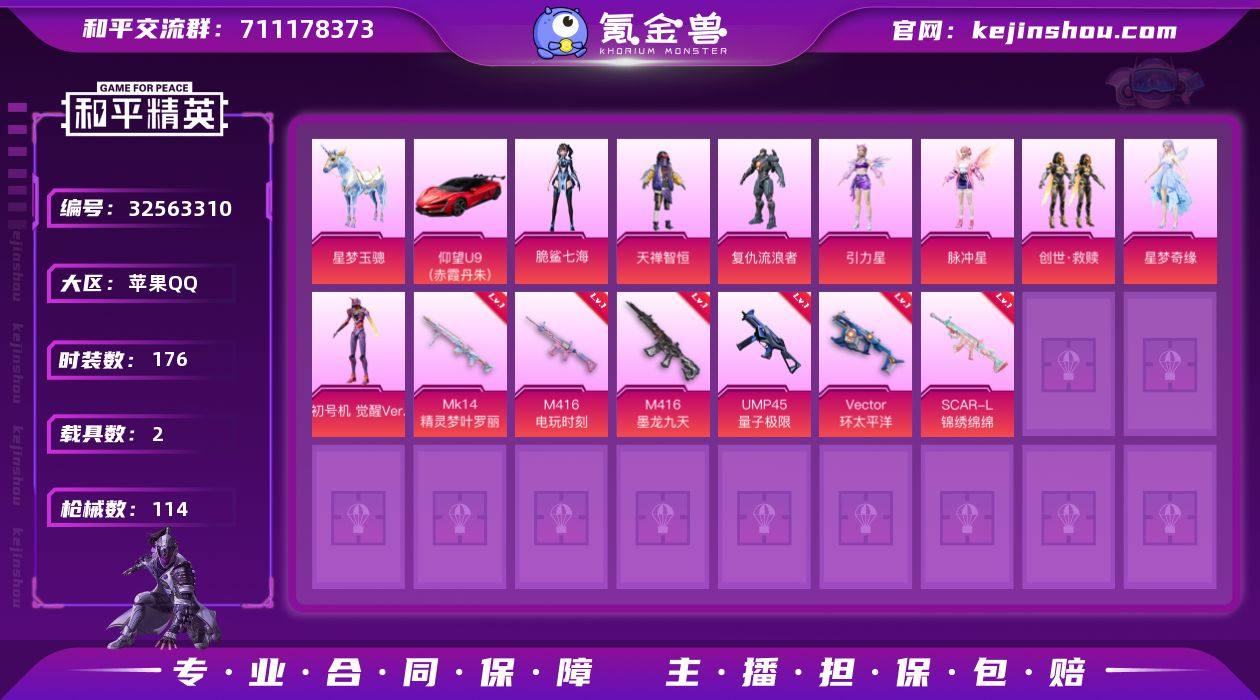 【稀有枪皮】镰刀-幽影之判,AUG-暖羊咩咩,蜜獾-荧海星豚,GROZA-镜光银凌,M416电玩时刻,Mk14精灵梦叶罗丽,M416墨龙九天,UMP45量子极限,Kar98K-巳巳如意,DP-28-豹影疾电,Vector环太平洋,SCAR-L-锦绣绵绵
