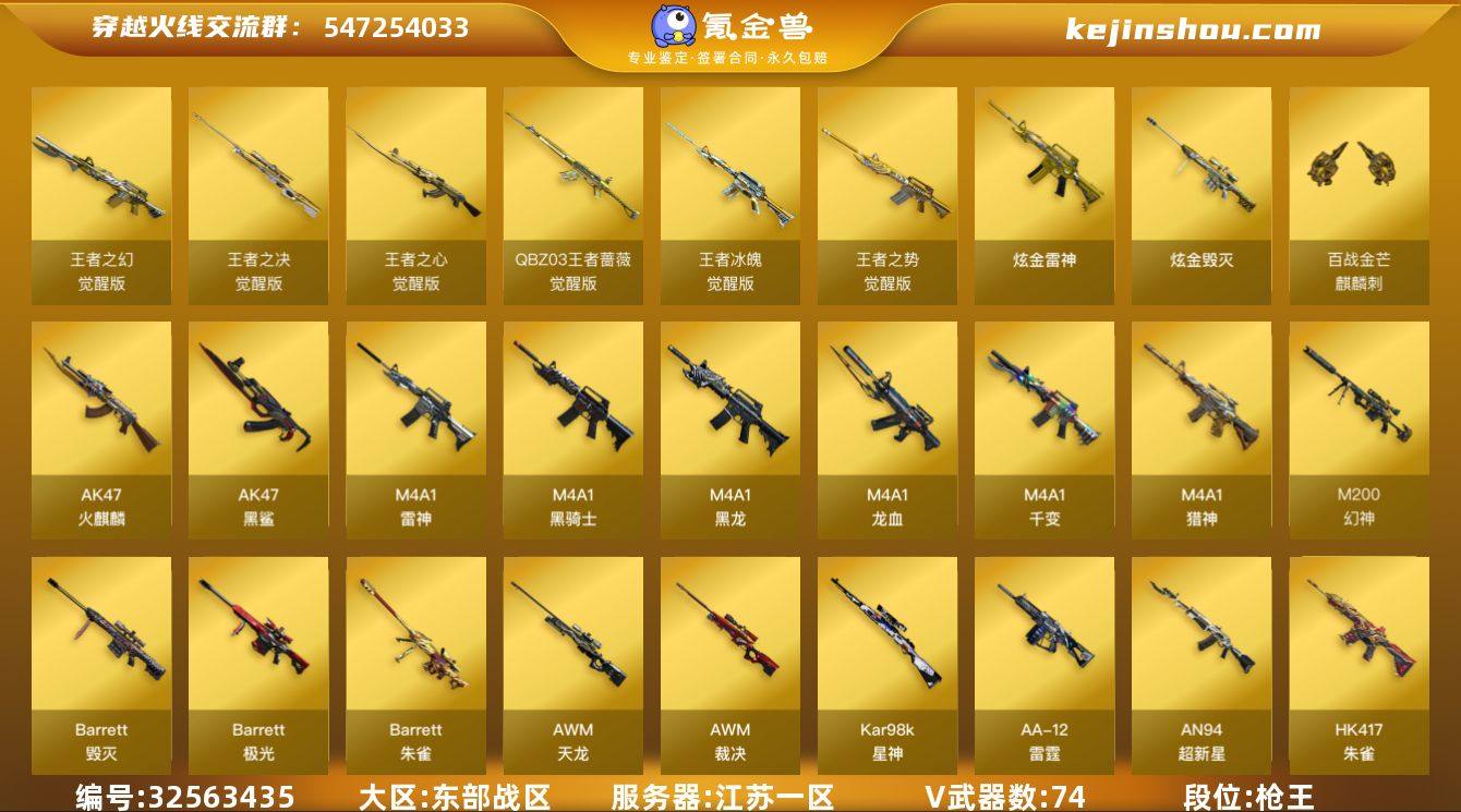 【ky5011】江苏一区-77V-19王者-2炫金 【热门武器】:QBZ03-金色蔷薇,HK417-朱雀,M4A1-青龙,M200-幻神,死亡之眼,Kar98K-星神,M4A1-黑骑士,汤姆逊-烈龙*6,RPK-盘龙*3,加特林-炼狱*5,沙鹰-修罗*3 【王者炫金武器】:炫金雷神,炫金毁灭 【音效卡】:M200-幻神音效卡,AK47-火麒麟音效卡,M4A1-雷神音效卡,M4A1-黑骑士音效卡 【皮肤】:幻神-周瑜皮肤,幻神-AG-CFPL S24冠军 皮肤,QBZ03-AG-CFPLS19冠军,雷神-暗月,M4A1-再燃火线,火麒麟-盘古,毁灭-风暴,毁灭-英雄计划 皮肤,黑龙-能量核心,战神-粉色甜心皮肤,AK47-B-常胜将军-刘备*2,AK47-B-常胜将军-孙权*2,天龙-秘银,屠龙-春桃 皮肤,轻型军用手斧-再燃火线,擎天-秘银 【角色】:零,樱,王者之瞳,王者玲珑-小乔,乔伊教练,修道士,风暴女,娟娟,兰-海滩派对,灵狐者-黄金海岸,灵狐者-职业经理,潘多拉-甜心教官,斯沃特-X,新娜塔莎 【人偶武器】:天龙-曼陀罗,火麒麟-灵狐,迷你裂空之翼*8,迷你生化手雷,闪光弹-小乔,闪光弹-貂蝉,高爆手雷-大乔 【暴走生化】:死亡之眼,超级对讲机 【挑战大师】:神圣爆裂者III,VEPR-12-金魔,机甲撕裂者III,阐释者III 【英雄级武器】:M4A1-千变,AK47-...