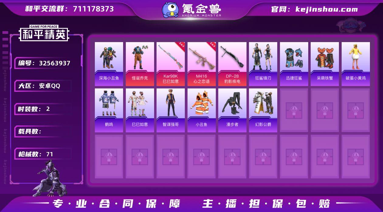 M1047095【男神素材身法号2粉装-5特效枪怪诞乔克,幻影战神 4AM战队服,深海小丑鱼,小丑鱼 M416-心之恋语[4级]】安卓手Q-2粉装-5特效枪-59套装-71枪皮-3王牌印记-传奇王牌15星-21187热力值【2粉装】怪诞乔克,幻影战神【5特效枪】AA12-G-萌骑幻想[3级],M416-心之恋语[4级],DP-28-豹影疾电[5级],Kar98K-巳巳如意[5级],Mk14-福马献瑞[5级]【4稀有】4AM战队服,深海小丑鱼,小丑鱼,AKM-缤纷海域【1飞行器】炫彩糖果飞行器【2头盔】深海小丑鱼头盔,幻影战神头盔【1背包】深海小丑鱼背包【119其它衣服和枪皮】竞技名士,幻影公爵,漫步者,迅捷狂鲨,SS37特训,疯狂小兔子,猎鹰,凌霄紫焰,巳巳如意,元素星魂,冷酷挑战者,智谋强哥,角色-紫俏灵猫,朱霞炽焰,马上有钱,角色-绯色魅影,SS31特训,琴音绮想,萌鸡速递,狙击之神,白色伏地魔,潮流炫酷,SS33特训,破蛋小黄鸡,呆萌铁蟹,福马献瑞,迅捷龙虾,风迹短诗,SS34特训,海岛探路者,元气之梦,红釉青花,蓝色运动,幻影武者,鹤鸣,星渊小夜曲,幻世保卫者,战术大师,雨过天青,夏日倾情,SS36特训,SS35特训,军械专家,擎苍青焰,黄色名流,魅力单车,绮丽涂鸦,阳光菠萝,湖蓝色名流,狂鲨锋刃,黄色运动,深蓝色名流,SS32特训,午间小调,UZI-影袭,UMP45-生命誓言,Mk47-风迹...