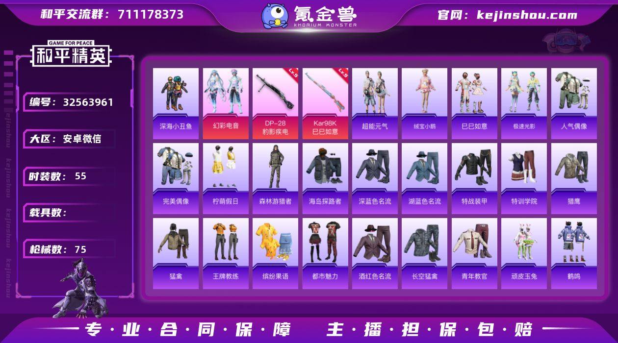 安卓 微信-1粉装-2特效枪-0载具-1粉色飞行器-17373热力值-2王牌印记-55套装-75枪皮 【热门品类】:套装-深海小丑鱼 【粉色套装】:粉装-幻彩电音 【粉色枪皮等级】:Kar98K-巳巳如意(五级),DP-28-豹影疾电(五级) 【粉色枪皮】:Kar98K-巳巳如意,DP-28-豹影疾电 【粉色降落伞】:月影灵韵降落伞,时光之吻降落伞,异瞳寒姬降落伞,极意拳锋降落伞,炫彩糖果降落伞 【稀有套装】:套装-绒宝小鹅,套装-巳巳如意,套装-超能元气,套装-雪国风尚,套装-炫彩糖果,套装-极速光影,角色-霜刃之御 【稀有枪皮】:AUG-冰晶雪宝,AKM-破晓战魂,M16A4-红色方程式,SCAR-L-夜灯,SCAR-L-炫彩节奏,SCAR-L-红色方程式,M416-红色方程式,M416-蓝色火焰,GROZA-恐龙拽拽,AUG-耀粉歌者,M762-天降萌叽,M762-彩虹符号,UZI-天降萌叽,UMP45-绒宝小鹅,汤姆逊-炫彩节奏,P90-巳巳如意,M24-炫彩节奏,Mini14-耀粉歌者,S686-时光之誓,S686-巳巳如意,S686-千金淑猫,M249-彩虹符号,M249-破晓战魂,M249-绯穹魔姬,MG3-幻世战舞者,短管霰弹-星穹咏叹调,突击盾牌-绝对恒星,撬棍-冷漠罗丽,破片手榴弹-巳巳如意 【其他套装】:套装-人气偶像,套装-完美偶像,套装-柠萌假日,套装-森林...