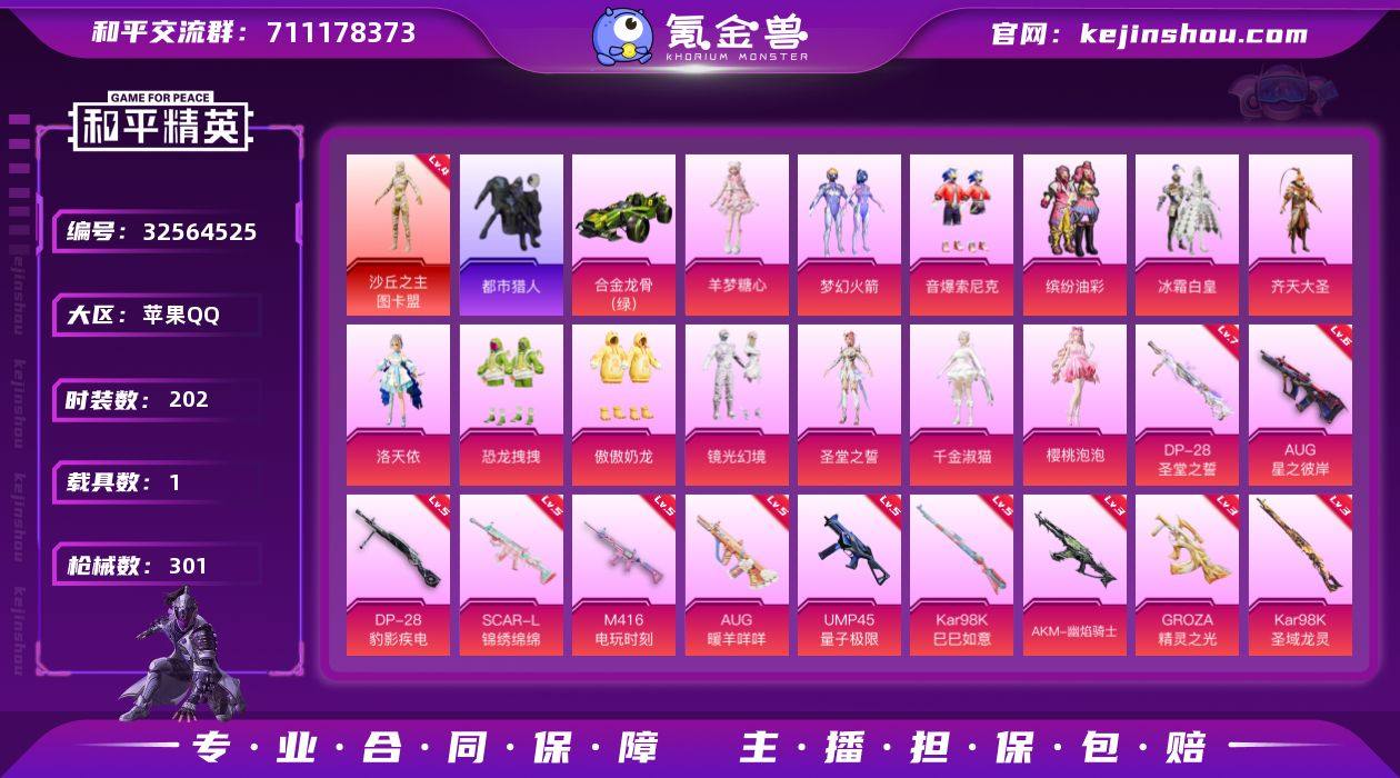 可二次,地铁满天,图卡盟(四级)梦幻火箭,浪漫天命,都市猎人,红熊茄茄苹果 手Q-1神装-14粉装-14特效枪-1载具-11粉色飞行器-104584热力值-14王牌印记-202套装-301枪皮 【红色神装等级】:沙丘之主-图卡盟(四级) 【红色角色神装】:沙丘之主-图卡盟 【热门品类】:粉装-梦幻火箭,粉装-音爆索尼克,粉装-缤纷油彩,套装-浪漫天命,套装-都市猎人 ,套装-小丑鱼,套装-龟仙人,套装-糯粉咩咩,角色-Mark.06,套装-红熊茄茄 【粉色套装】:粉装-梦幻火箭,粉装-缤纷油彩,粉装-冰霜白皇,粉装-齐天大圣,角色-洛天依,粉装-恐龙拽拽,粉装-音爆索尼克,粉装-傲傲奶龙,粉装-镜光幻境,角色-圣堂之誓,角色-千金淑猫,角色-樱桃泡泡,角色-羊梦糖心,角色-罪夜之冕 【粉色枪皮等级】:AKM-幽焰骑士(三级),SCAR-L-锦绣绵绵(五级),M416-电玩时刻(五级),GROZA-精灵之光(三级),AUG-星之彼岸(六级),AUG-暖羊咩咩(五级),UMP45-量子极限(五级),AKS-74U-森灵之息(五级),Kar98K-巳巳如意(五级),Kar98K-圣域龙灵(三级),Mk14-福马献瑞(五级),DP-28-圣堂之誓(七级),DP-28-豹影疾电(五级),燃烧瓶-薄荷可可(六级) 【粉色载具】:合金龙骨(绿) 【粉色枪皮】:AKM-幽焰骑士,SCAR...