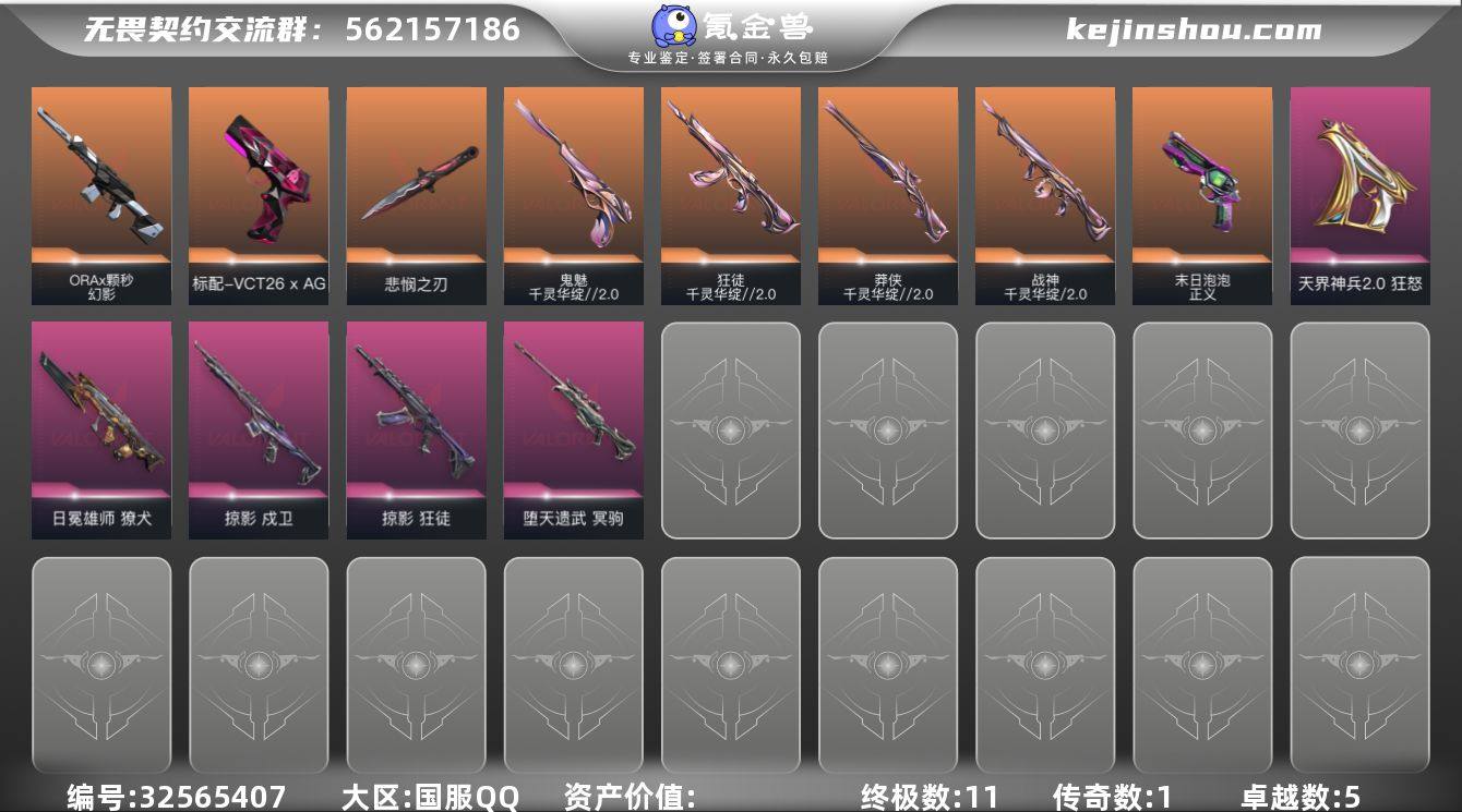 【套装】:无畏契约季前邀请赛套装,千灵华绽//2.0套装 【英雄】:炼狱,暮蝶,壹决,捷风,不死鸟,贤者,猎枭,芮娜,奇乐,尚勃勒,霓虹,星礈,K/O,盖可,黑梦 【近战武器】:近战武器-碎心裂刃,近战武器-无畏契约季前邀请赛 悲悯之刃,近战武器-流风回雪,近战武器-影钩 【狂徒】:狂徒-千灵华绽//2.0,狂徒-掠影 【幻影】:幻影-ORA x 颗秒 【戍卫】:戍卫-掠影 【獠犬】:獠犬-日冕雄师 【冥驹】:冥驹-堕天遗武 【莽侠】:莽侠-千灵华绽//2.0 【战神】:战神-千灵华绽//2.0 【VCT手枪】:标配-VCT26 x AG 【正义】:正义-末日泡泡 【鬼魅】:鬼魅-千灵华绽//2.0 【狂怒】:狂怒-天界神兵//2.0 【卡面】:树懒大作战 卡面,无畏契约GO!第一卷:零 卡面,《双城之战》金克丝 卡面,代号红色 卡面,新兵报到 卡面,V契约 卡面,无畏契约 卡面 【喷漆】:霓光四射 喷漆,买装还是存钱 喷漆,关门放狗 喷漆,无畏契约GO!第一卷:贤者 喷漆,胜利属于无畏契约 喷漆,GLHF 喷漆,无畏契约 喷漆 【挂饰】:无畏契约GO!第一卷 芮娜 挂饰,无畏契约GO!第一卷 零 挂饰,鱼骨头 挂饰,无畏契约 纪念币 挂饰