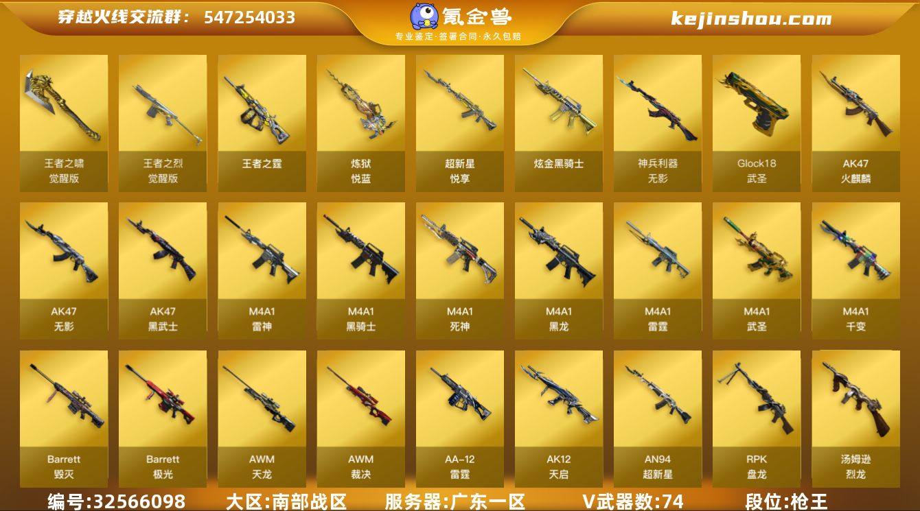 【ky6421】广东一区-81V-7王者武器数-1炫金武器数 【热门武器】:死亡之眼,M4A1-黑骑士,汤姆逊-烈龙*8,RPK-盘龙*3,沙鹰-修罗 【王者炫金武器】:超新星-悦享,炼狱-悦蓝*2,王者之霆,炫金骑士 【音效卡】:Barrett-毁灭音效卡,Barrett-碧霄极光音效卡 【皮肤】:裁决-胜者为王 皮肤,烈龙-星空,火麒麟-雷神,毁灭-星空,黑龙-能量核心,黑骑士-暗月*3,无影-暗月,无影-能量核心,死神-秘银,天龙-能量核心,极光-能量核心,修罗-能量核心,轻型军用手斧-再燃火线,擎天-秘银 【角色】:零,葵,炫,零·纪元,修道士,幻面灵狐,北极狐-X,初恋灵狐,风暴女,嘉年华灵狐,葵-赛博朋克,潘多拉-甜心教官,斯沃特-X,铁骑荣耀,影武者-X 【人偶武器】:火麒麟-灵狐,AWM-灵狐-15周年嘉年华,COP-旗袍,迷你波特博士,夺魂,迷你生化手雷,深渊终结者手雷 【暴走生化】:死亡之眼 【挑战大师】:激光毁灭者III-白马银枪 【英雄级武器】:M4A1-千变,AK47-火麒麟,M4A1-黑龙,M4A1-雷神,M4A1-黑骑士,AK47-无影,M4A1-死神,AK47-黑武士,AK12-天启,AN94-超新星,M4A1-武圣*3,M4A1-雷霆,无影-神兵利器,超新星-悦享-觉醒版,王者之烈-觉醒版,HK417-朱雀-电竞之星,AWM...