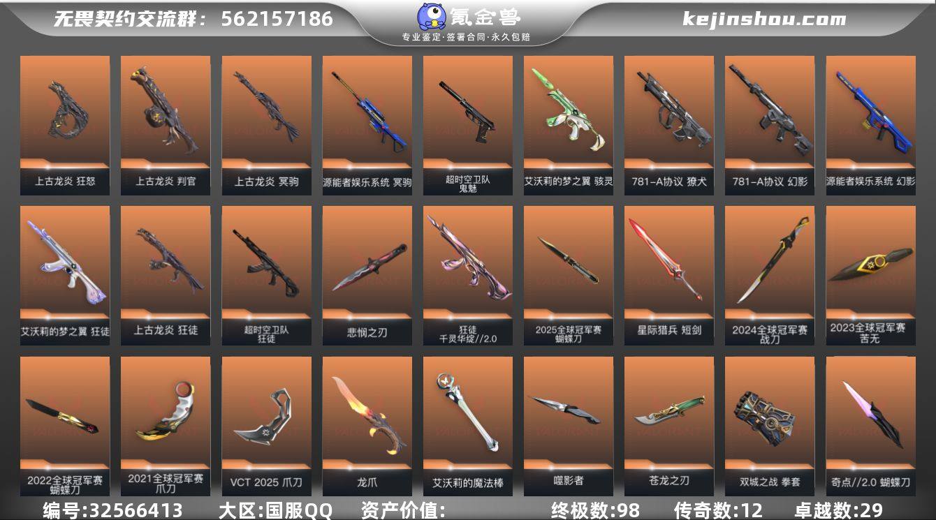 【Hww441】Q区 皮肤价值275050 【98橙皮 12金皮 29紫皮 272皮肤 28英雄 232卡面 2250已用源晶】 优质装备:2025冠军套,2024冠军套,2023冠军套,2022冠军套,2021冠军套 【套装】:2025全球冠军赛套装,2024全球冠军赛套装,2023全球冠军赛套装,2022全球冠军赛套装,2021全球冠军赛套装,上古龙炎套装,无畏契约季前邀请赛套装,光荣异象套装,虚空遗器套装,VCT 2025 赛季套装,西部未来套装,创·纪元套装,RGX 11z Pro//3.0套装,混沌序曲套装,《双城之战》收藏套装,归零者套装,偃月苍龙套装,VCTxEDG 队伍套装,英雄之选套装,天界神兵套装,堕天遗武套装,般若假面//2.0套装,魄月玄兔套装 【英雄】:幻棱,炼狱,维斯,暮蝶,钛狐,壹决,铁臂,捷风,雷兹,幽影,不死鸟,贤者,猎枭,蝰蛇,零,芮娜,奇乐,尚勃勒,霓虹,斯凯,夜露,星礈,K/O,海神,盖可,黑梦,钢锁 【近战武器】:近战武器-2025全球冠军赛 蝴蝶刀,近战武器-2024全球冠军赛 战刀,近战武器-2023全球冠军赛 苦无,近战武器-2022全球冠军赛 蝴蝶刀,近战武器-2021全球冠军赛 爪刀,近战武器-碎心裂刃,近战武器-无畏契约季前邀请赛 悲悯之刃,近战武器-魔术火花,近战武器-影钩,近战武器-超...