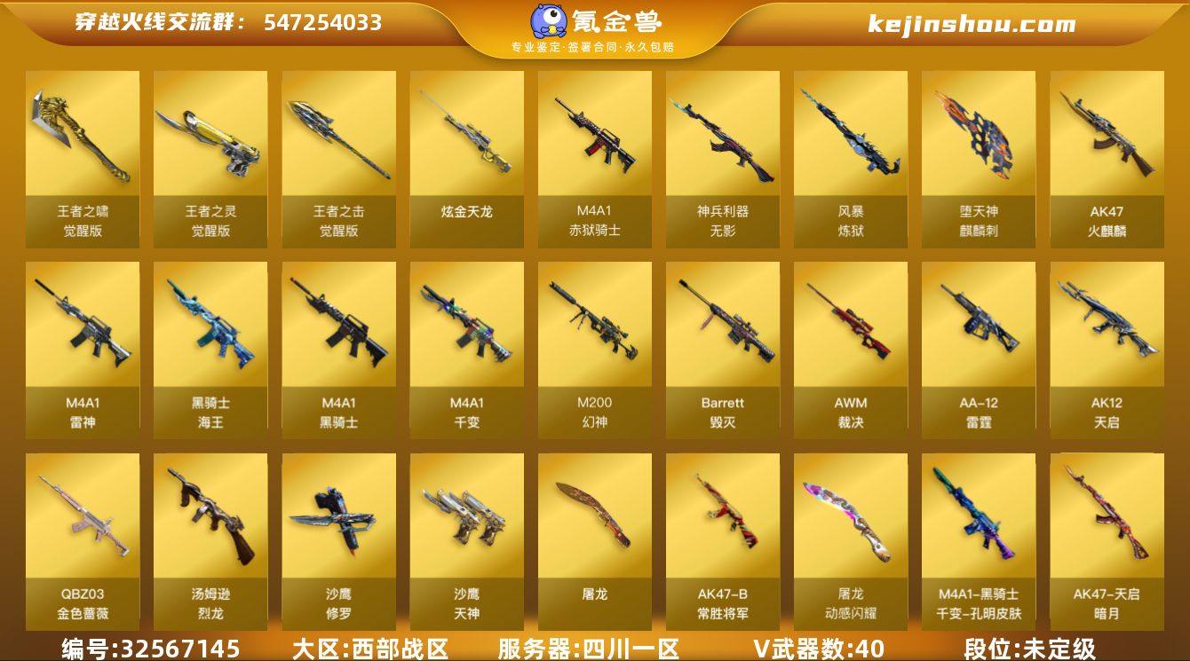 四川一区-42V-4王者-1炫金 【热门武器】:QBZ03-金色蔷薇,M200-幻神,牛牛-AK47,M4A1-黑骑士,汤姆逊-烈龙*4,加特林-炼狱,羊驼玩偶,沙鹰-修罗 【王者炫金武器】:炫金天龙 【音效卡】:修罗-云海游龙音效卡,M4A1-黑骑士音效卡 【皮肤】:幻神-荣耀世冠EP 皮肤,QBZ03-荣耀世冠EP 皮肤,裁决-流光秘银,雷神-源计划2.0专属 皮肤,火麒麟-平天大圣,火麒麟-百城,毁灭-黑大圣皮肤,毁灭-风暴*2,毁灭-英雄计划 皮肤,M4A1-千变-孔明皮肤,无影-能量核心,天启-暗月,战神-紫绶金章皮肤,战神-流金岁月皮肤,AK47-B-常胜将军-曹操,AK47-B-常胜将军-刘备,AK47-B-常胜将军-孙权*2,天龙-能量核心,屠龙-春桃 皮肤,轻型军用手斧-再燃火线 【角色】:妮妮,王者春,蛇隐宗,乔伊教练,修道士,云海玲珑,暗夜-X,风暴女*2,嘉年华灵狐,灵狐者-黄金海岸,灵狐者-七夕宝贝,灵狐者-职业经理,曼陀罗-X,潘多拉-X,潘多拉-甜心教官,蛇姬,兔囡囡,维纳斯 【人偶武器】:AWM-灵狐-15周年嘉年华,牛牛-AK47,迷你深渊冰龙,迷你裂空之翼*2,迷你牛牛,迷你生化手雷,生化手雷-机甲核心,深渊终结者手雷,闪光弹-貂蝉,高爆手雷-大乔,迷你艾比 【暴走生化】:黑龙吞噬者,超级...