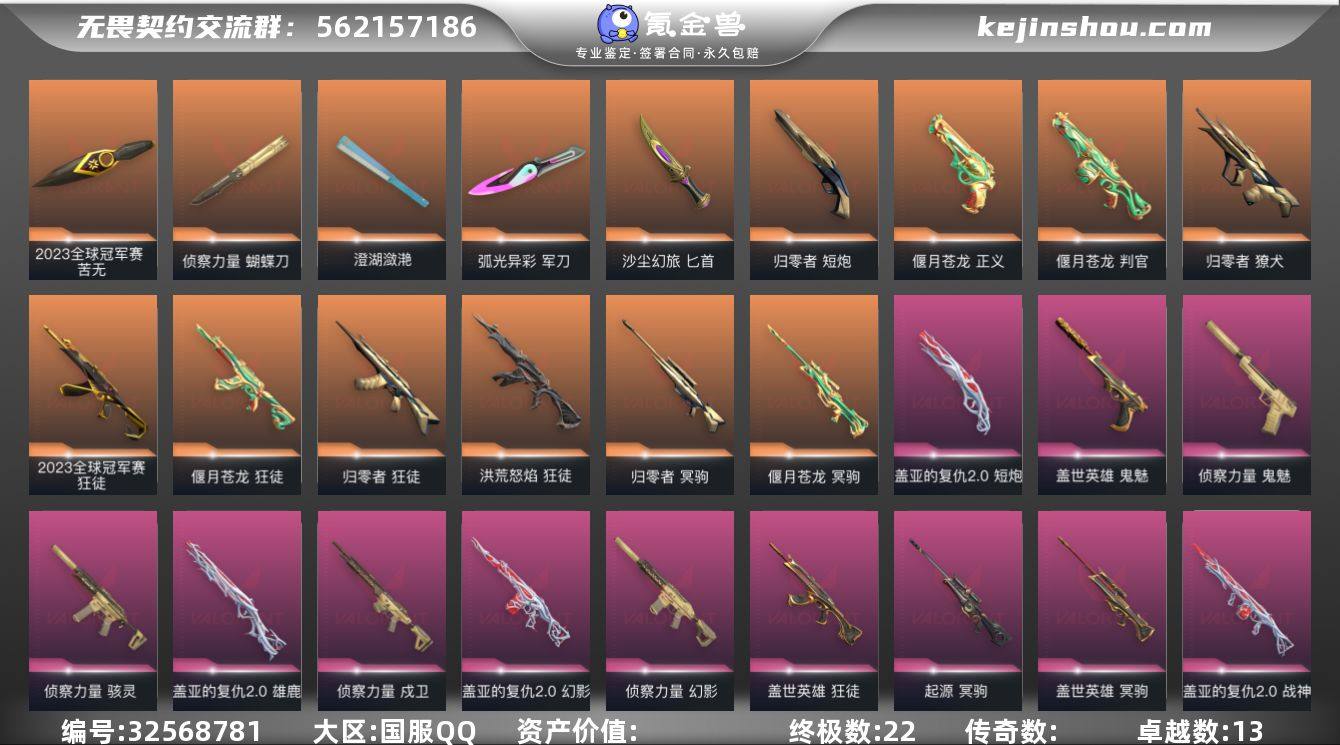 【套装】:2023全球冠军赛套装,归零者套装,偃月苍龙套装,盖亚的复仇//2.0套装,侦察力量套装,盖世英雄套装 【英雄】:炼狱,暮蝶,壹决,铁臂,捷风,雷兹,幽影,不死鸟,贤者,猎枭,蝰蛇,零,芮娜,奇乐,尚勃勒,霓虹,斯凯,夜露,星礈,K/O,海神,盖可,黑梦,钢锁 【近战武器】:近战武器-2023全球冠军赛 苦无,近战武器-侦察力量 蝴蝶刀,近战武器-剥皮小刀,近战武器-澄湖潋滟,近战武器-定海神珍,近战武器-盖亚之愠,近战武器-弧光异彩 军刀,近战武器-魄月玄刃,近战武器-沙尘幻旅 匕首,近战武器-生物收割器,近战武器-偃月 【狂徒】:狂徒-2023全球冠军赛,狂徒-归零者,狂徒-洪荒怒焰,狂徒-偃月苍龙,狂徒-盖世英雄,狂徒-弧光异彩,狂徒-沙尘幻旅 【幻影】:幻影-盖亚的复仇//2.0,幻影-侦察力量,幻影-噬源兽防卫工程 【戍卫】:戍卫-侦察力量,戍卫-彩梦之城,戍卫-萌彩剪影 【獠犬】:獠犬-归零者,獠犬-弧光异彩,獠犬-胡桃狂想 【冥驹】:冥驹-归零者,冥驹-偃月苍龙,冥驹-盖世英雄,冥驹-起源,冥驹-胡桃狂想 【飞将】:飞将-沙尘幻旅,飞将-信手涂鸦 【战神】:战神-盖世英雄,战神-盖亚的复仇//2.0,战神-萌彩剪影 【奥丁】:奥丁-信手涂鸦...