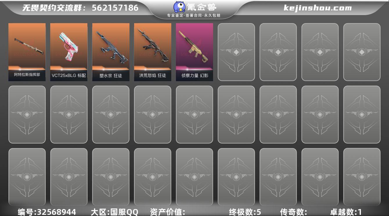 【英雄】:幻棱,炼狱,维斯,暮蝶,钛狐,壹决,铁臂,捷风,雷兹,幽影,不死鸟,贤者,猎枭,零,芮娜,奇乐,尚勃勒,霓虹,斯凯,盖可,黑梦,钢锁 【近战武器】:近战武器-影钩,近战武器-阿特拉斯指挥部 甩棍 【狂徒】:狂徒-洪荒怒焰,狂徒-塑水宗 【幻影】:幻影-侦察力量 【VCT手枪】:标配-VCT25 x BLG 【卡面】:树懒大作战 卡面,Clutch 卡面,无畏契约GO!第一卷:芮娜 卡面,无畏契约GO!第一卷:零 卡面,《双城之战》金克丝 卡面,无畏契约GO!第一卷:贤者 卡面,代号红色 卡面,新兵报到 卡面,V契约 卡面,无畏契约 卡面 【喷漆】:霓光四射 喷漆,买装还是存钱 喷漆,关门放狗 喷漆,松叶 喷漆,胜利属于无畏契约 喷漆,GLHF 喷漆,无畏契约 喷漆 【挂饰】:天外飞客 挂饰,无畏契约 纪念币 挂饰