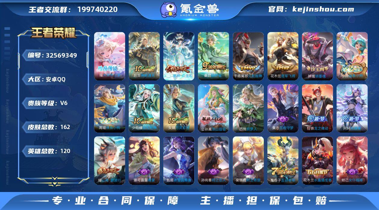 珍品传说1 星元6 传说5 史诗46 限定49 英雄120 皮肤162 稀有英雄7 贵族6级 总场次4453自用一手老号,有传说皮和瑶的大耳狗 2000+游戏天数,信誉7级无违规无封禁。162款皮肤,32级收藏,有王者印记,游走14段,铭文齐全。安全可靠,诚心出,爽快可小刀,中介骗子勿扰。
