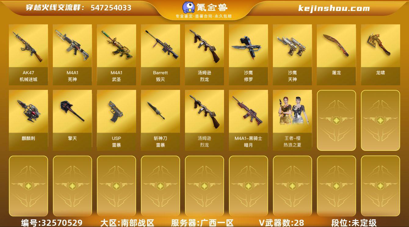 广西一区-29V-0王者武器数-0炫金武器数 【热门武器】:死亡之眼,汤姆逊-烈龙*6,斯泰尔-蝴蝶,USP-雷暴,沙鹰-修罗 【皮肤】:黑骑士-暗月,修罗-能量核心 【角色】:樱,北极狐-X,娟娟,铁骑荣耀 【人偶武器】:斯泰尔-蝴蝶 【暴走生化】:死亡之眼,超级对讲机 【英雄级武器】:M4A1-死神,M4A1-武圣,AK47-机械迷城,Barrett-毁灭,汤姆逊-烈龙*6,沙鹰-修罗,沙鹰-天神*2,USP-雷暴,屠龙,龙啸,擎天,麒麟刺,斩神刀-雷暴,高爆手雷-雷暴*3,闪光弹-雷暴*3,烟雾弹-雷暴*3 【道具】:战舰背包,夺命之镰,防化服,防弹头盔,防弹衣,C4工具钳,手雷包 【特殊枪械】:蝴蝶斯泰尔+6烈龙,6烈龙,1蝴蝶斯泰尔