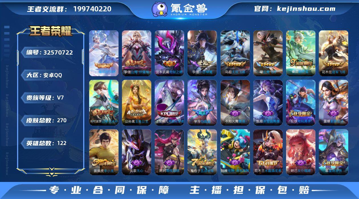 安卓Q-V7-荣耀黄金IV段位-122英雄-270皮肤-1典藏皮肤-8传说-68史诗 【英雄全皮】:李信全皮 【荣耀典藏】:伽罗最初的交响 【传说皮肤】:桑启鸣野蒿,李信山海炽霜斩,马超无双飞将,曜李逍遥 ,曜云鹰飞将,李信一念神魔,花木兰冠军飞将,宫本武藏地狱之眼 【限定皮肤】:姜子牙天穹之誓,杨戬破阵退雄兵,狄仁杰阴阳师,赵云皇家上将,孙尚香蔷薇恋人,鲁班七号狮舞东方,庄周高山流水,阿轲迷踪丽影,白起夜都怪侠,芈月重明,元歌无心,夏侯惇朔风刀,甄姬游园惊梦,马可波罗山海玄木吟,狄仁杰魔术师,狄仁杰万华元夜,达摩沙漠行僧,项羽海滩派对,老夫子醍醐杖,程咬金演武夺筹,刘邦夺宝奇兵,王昭君午后时光,兰陵王金庭之子,李元芳云中旅人,钟馗神迹守卫,钟馗驱傩正仪,杨玉环遇见飞天,雅典娜单词大作战,蔡文姬繁星吟游,鬼谷子原初探秘者,鬼谷子五谷丰年,苏烈千军破阵,百里玄策原初追逐者,弈星混沌棋,公孙离玉兔公主,沈梦溪大漠名商,明世隐疑决卦,明世隐吟游魔法,裴擒虎李小龙,裴擒虎擒涛扼浪,狂铁御狮,狂铁电玩高手,米莱狄御霄,云中君纤云弄巧,李信山海炽霜斩,盾山御銮,上官婉儿梁祝,上官婉儿天狼绘梦者,嫦娥拒霜思,嫦娥暖冬兔眠,曜...