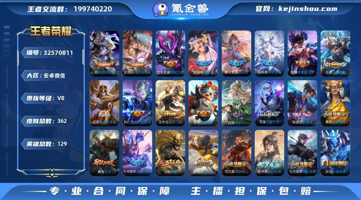 安卓WX-V8-最强王者段位-129英雄-362皮肤-2典藏皮肤-1典藏英雄-11传说-104史诗 【英雄全皮】:刘邦全皮,盾山全皮,敖隐全皮,鲁班大师全皮,金蝉全皮,空空儿全皮 【荣耀典藏】:武则天英雄,武则天倪克斯神谕,铠银白咏叹调 【传说皮肤】:夏洛特浮生妄,吕布怒海麟威,娜可露露前尘镜,孙尚香异界灵契,虞姬启明星使,花木兰冠军飞将,梦奇胖达荣荣,后羿黄金射手座,貂蝉仲夏夜之梦,宫本武藏地狱之眼,狄仁杰超时空战士 【限定皮肤】:杨戬破阵退雄兵,狄仁杰阴阳师,赵云皇家上将,墨子神迹守卫,嬴政优雅恋人,嬴政白昼王子,孙尚香异界灵契,庄周高山流水,阿轲迷踪丽影,钟无艳超时空战士,扁鹊奇幻香踪,白起夜都怪侠,芈月白晶晶,芈月幻夜卜梦,吕布猎兽之王,元歌云间偶戏,元歌无心,夏侯惇匿光决锋者,甄姬落雪兰心,曹操烛龙,典韦蓝屏警告,典韦岱宗,马可波罗暗影游猎,狄仁杰魔术师,狄仁杰万华元夜,达摩星际陆战队,达摩沙漠行僧,项羽海滩派对,老夫子醍醐杖,老夫子航海奇遇记,关羽冰锋战神,程咬金演武夺筹,刘邦夺宝奇兵,王昭君午后时光,兰陵王金庭之子,娜可露露前尘镜,亚瑟潮玩骑士王,孙悟空至尊宝,孙悟空孙行者,牛魔御旌,牛魔奔雷神使,...