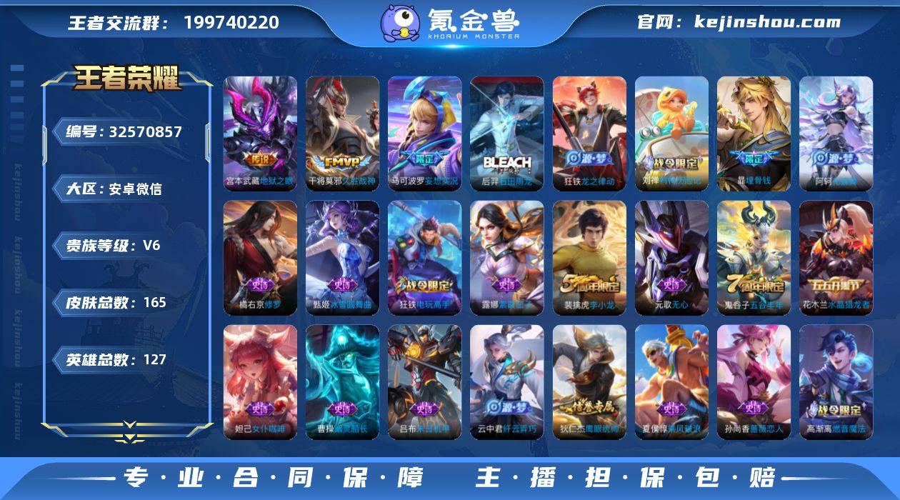 安卓WX-V6-永恒钻石III段位-127英雄-165皮肤-5传说-46史诗 【英雄全皮】:孙权全皮,敖隐全皮 【传说皮肤】:马超神骥逐星野,后羿神树通天,马可波罗妄想实况,干将莫邪久胜战神,宫本武藏地狱之眼 【限定皮肤】:暃埋骨钱,姜子牙天穹之誓,狄仁杰阴阳师,赵云皇家上将,孙尚香蔷薇恋人,高渐离玩趣恶龙,吕布猎兽之王,元歌无心,马可波罗妄想实况,狄仁杰魔术师,达摩沙漠行僧,项羽海滩派对,王昭君午后时光,兰陵王金庭之子,李元芳云中旅人,鬼谷子五谷丰年,沈梦溪大漠名商,裴擒虎李小龙,裴擒虎擒涛扼浪,狂铁电玩高手,云中君纤云弄巧,上官婉儿梁祝,鲁班大师探海日志,桑启海盐诗旅,阿古朵江河有灵,张良古海寻踪,高渐离燃音魔法,妲己灵卜魔法,鬼谷子天穹祈灯,沈梦溪龙舞盛年,刘邦剑破天穹,程咬金群星魔术团,周瑜熔金海岸 【赛季限定】:达摩沙漠行僧,兰陵王金庭之子,沈梦溪大漠名商,李元芳云中旅人,桑启海盐诗旅,裴擒虎擒涛扼浪,鲁班大师探海日志,张良古海寻踪,鬼谷子天穹祈灯,刘邦剑破天穹,姜子牙天穹之誓,东皇太一噬灭天穹,太乙真人谧流熔炉,钟馗虚灵犬护,亚瑟荣光之誓 【战令限定】:吕布猎兽之王,狂铁电玩高手,王昭君午后时光,高...