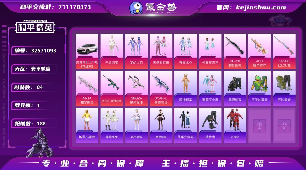 HJ6570 可二 社交场景限制 61级 1载具6粉装7特效枪 路特斯EL灰色 【6粉装】 梦幻火箭 天使彩虹糖 千金淑猫 时光之吻 仲夏莫吉托 霁雪冰心 【7特效枪】 Kar98K-巳巳如意 (5级) M762-青锋波束 (5级) DP-28-豹影疾电 (5级) AUG-暖羊咩咩 (5级) Mk14-甜梦熊击 (5级) GROZA-镜光银凌 (5级) SCAR-L-青春物语 (7级) 【14热门】 萌神柯基 鹰眼刺客 激萌罗小黑 胖达团团 暗影哥特 西部牛仔 狂沙舞者 漫步者 破蛋小黄鸡 风华少年志 英勇保护者 M762-奇异狩猎者 M24-奇异狩猎者 S686-奇异狩猎者 【2头盔】 国宝胖达头盔 夏日绵绵冰头盔 【1背包】 萌熊伴侣背包 营地ID: