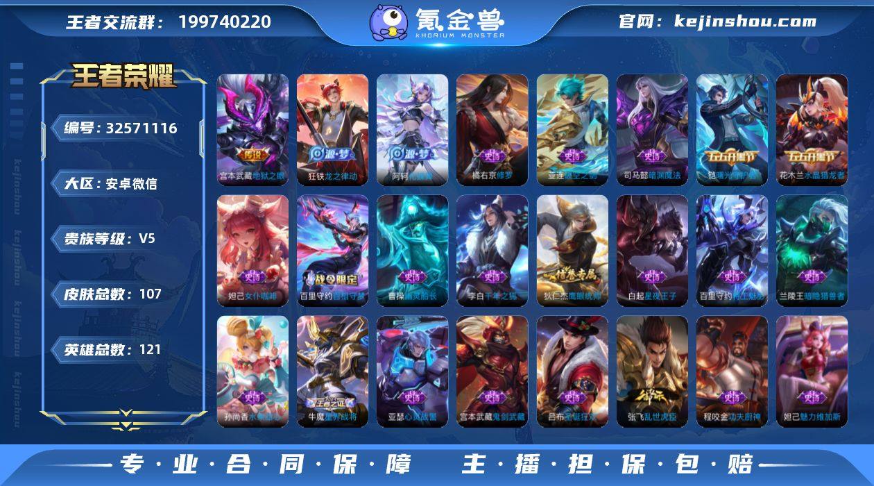 [17831865]V5 4传说 121英雄 107皮肤 可修改实名 女号 有社交限制 【英雄全皮】敖隐全皮,蚩奼全皮,大禹全皮 【稀有英雄】敖隐(小龙人),大司命,嬴政(始皇帝),韩信(韩跳跳),夏洛特(夏师傅),艾琳,橘右京(橘子),娜可露露(鸟人),不知火舞,赵云,金蝉(唐僧),戈娅 【传说皮】诡秘之主,地狱之眼 【赛季/战令皮】噬灭天穹(s37),天穹之誓(s36),银河之约,迷踪丽影 【史诗皮】破空之剑,星界战将,百相守梦-百里守约,化蝶舞,织梦人,线条小狗-周瑜,九幽镇关,罗小黑战记-百里玄策,龙之律动,百相守梦-黄忠,特工魅影,千年之狐,乱世虎臣,修罗,女仆咖啡,水果甜心,星夜王子,功夫厨神,暗隐猎兽者,幽灵船长,鬼剑武藏,暗渊魔法,心灵战警,水晶猎龙者,曙光守护者,圣诞狂欢,鹰眼统帅,魅力维加斯,赏金猎手,无心 【限定皮】逐霄战戟,鸣野蒿,齐天大圣,梁祝 【普通皮】赤刃凌霄,谧流熔炉,敬我三分,动物派对,怪诞之夜,百相守梦-老夫子,苍林狼骑,金福满堂,灵卦秘语,爆裂喵拳,劲辣红锅,龙舞盛年,玫蓝誓约,虚灵犬护,荣光之誓,罗小黑战记-张良,逐霄之志,溯影追猎,糖果风暴,班班快跑,罗小黑战记-哪吒,极光幻客,克喵,春野闲踪,灵野札记,命运加冕,踏浪烽翎,死霸装,锦麟游梦,逆浪荇歌,西部游侠,龙腾万里,花好人间,归虚梦...