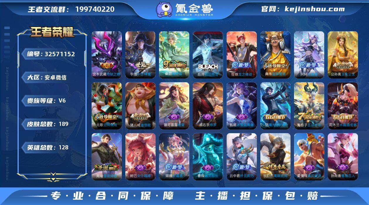 安卓WX-V6-至尊星耀V段位-128英雄-189皮肤-6传说-55史诗 【英雄全皮】:孙权全皮,敖隐全皮,影全皮 【传说皮肤】:云缨神骥越千峰,貂蝉神骥聚万邦,后羿神树通天,桑启鸣野蒿,李信一念神魔,宫本武藏地狱之眼 【限定皮肤】:姜子牙天穹之誓,狄仁杰阴阳师,赵云皇家上将,孙尚香蔷薇恋人,庄周高山流水,芈月幻夜卜梦,元歌云间偶戏,甄姬游园惊梦,典韦蓝屏警告,狄仁杰魔术师,狄仁杰万华元夜,达摩沙漠行僧,项羽海滩派对,程咬金演武夺筹,兰陵王金庭之子,李元芳云中旅人,钟馗神迹守卫,钟馗驱傩正仪,鬼谷子五谷丰年,黄忠火炮绅士,苏烈千军破阵,公孙离玉兔公主,沈梦溪大漠名商,云中君纤云弄巧,猪八戒猪悟能,嫦娥拒霜思,桑启海盐诗旅,张良古海寻踪,高渐离燃音魔法,妲己灵卜魔法,鬼谷子天穹祈灯,沈梦溪龙舞盛年,鲁班七号蔬乡物语,李元芳蔬乡物语,刘邦剑破天穹,程咬金群星魔术团,镜青焰无极,项羽苍威无极,周瑜熔金海岸 【赛季限定】:狄仁杰万华元夜,程咬金演武夺筹,钟馗驱傩正仪,苏烈千军破阵,达摩沙漠行僧,兰陵王金庭之子,沈梦溪大漠名商,李元芳云中旅人,桑启海盐诗旅,张良古海寻踪,鬼谷子天穹祈灯,刘邦剑破天穹,姜子牙天穹之誓,东...