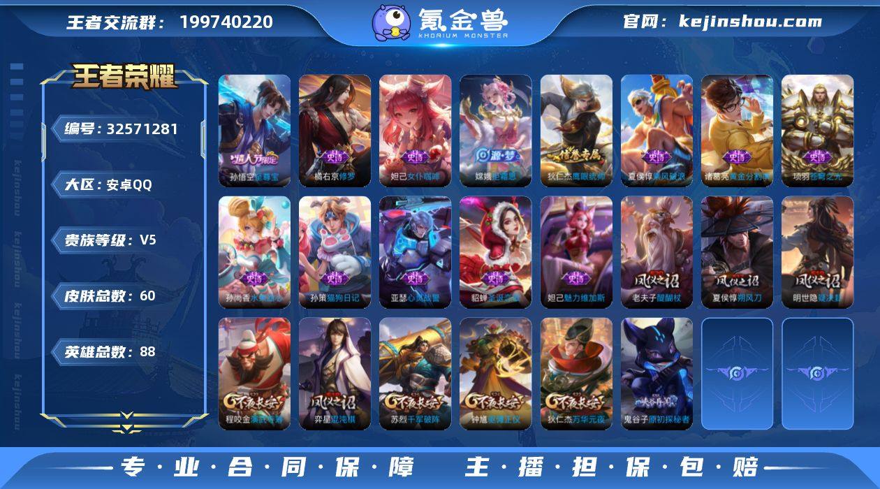 JJ4102:一体号和平浪客战士安卓Q-V5-荣耀黄金II-88英雄-60皮肤-【至尊宝 朱雀志 2太阳 0违规】-15史诗 【稀有英雄】 不知火舞 橘右京 夏洛特 娜可露露 韩信 艾琳 赵云 【限定皮肤】 至尊宝 【史诗皮肤】 苍穹之光 心灵战警 修罗 拒霜思 魅力维加斯 黄金分割率 女仆咖啡 鹰眼统帅 猫狗日记 朱雀志 皇家上将 至尊宝 圣诞恋歌 水果甜心 乘风破浪 【勇者皮肤】 圆桌骑士 缤纷绘卷 大发明家 朔风刀 醍醐杖 黑桃队长 黄金武士 阴阳师 海滩派对 万华元夜 演武夺筹 哥特玫瑰 原初探秘者 疑决卦 化身博士 霸王丸 死亡骑士 海滩丽影 忍·炎影 乓乓大师 兔女郎 千军破阵 教廷特使 紫罗兰之誓 少女阿狸 混沌棋 驱傩正仪 【其他皮肤】 战争骑士 棒球奇才 龙域领主 生化警戒 花见巫女 灼热之刃 木偶奇遇记 福禄兄弟 午夜歌剧院 隐刃 异域舞娘 激情绿茵 归虚梦演 西部大镖客 荷鲁斯之眼 特种部队 绝影神枪 加勒比小姐