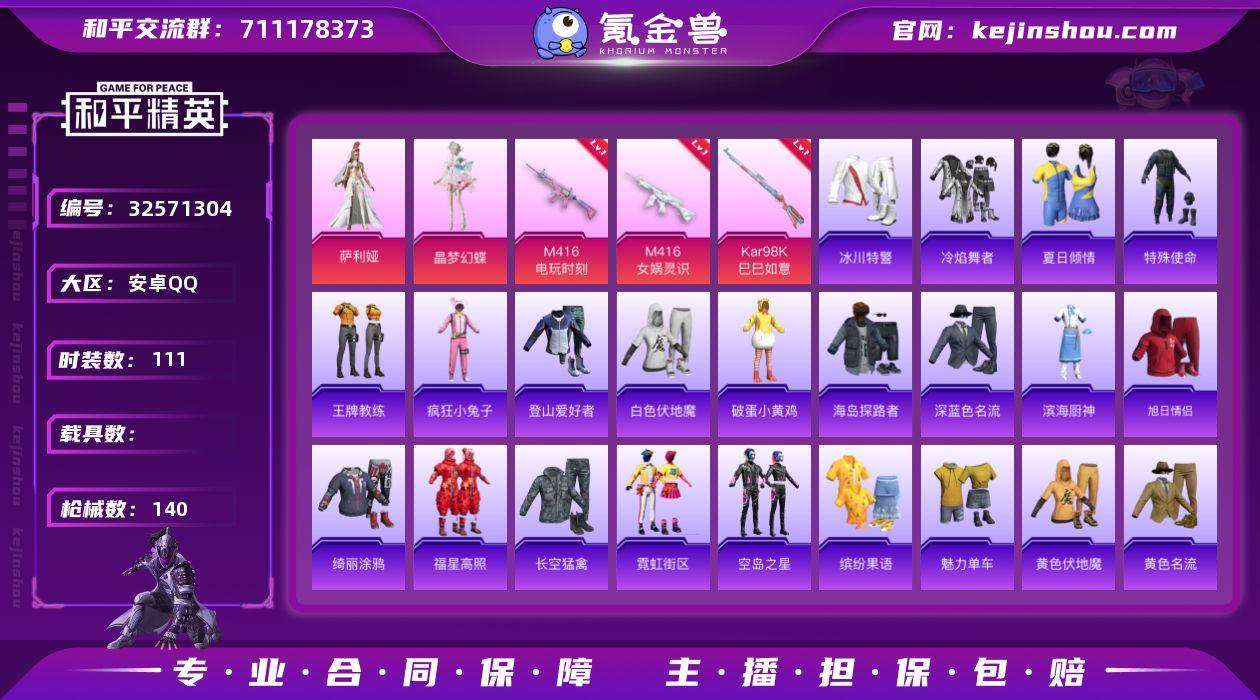 - 1红装3级 4粉装-6特效枪 最终圣卫者-帕修斯 可二次 地铁已开 -39743热力值-4王牌印记-87套装-140枪皮【优质套装】: 幻星舰长 幻彩电音 晶梦幻蝶 萨利娅【特效枪等级】:M416-女娲灵识(三级- M416-女娲灵识)Kar98K-巳巳如意(五级- Kar98K-巳巳如意)M416-电玩时刻(五级- M416-电玩时刻)【优质武器皮肤】: M416-女娲灵识 Kar98K-巳巳如意 M416-电玩时刻【稀有武器皮肤】: DBS-乌木金纹 SCAR-L-海盐豹豹 M416-女娲灵识 Kar98K-巳巳如意 Mk14-冰河战士 M16A4-冰河战士 20-H-乌木金纹 M416-电玩时刻 PKM-紫幽梦 Mk14-紫幽梦 蜜獾-乌木金纹 S1897-紫幽梦 P92-紫幽梦 PKM-啾咪啾咪 M416-蓝色火焰 M416-糯团青竹 AKM-破晓战魂 AKM-龙的传人 SCAR-L-夜灯 M16A4-蓝色火焰 AUG-耀粉歌者 AUG-天降萌叽 QBZ-洛神天依 QBZ-彩虹符号 M762-彩虹符号 Mk47-洛神天依 蜜獾-天降萌叽 Kar98K-影袭 AWM-天降萌叽 AWM-黄金龙骨 AWM-焰鹰斗篷 AMR-乌木金纹 M200-惊鸿侠骨 SKS-炫彩节奏 Mini14-千面幻镜 M417-惊鸿侠骨 UZI-天降萌叽 UMP45-夜灯 Vector-生命誓言 Vector-焰鹰斗篷 汤姆逊-天降萌叽 汤姆逊-炫彩节奏 MP5K-乌木金纹 P90-乌木金纹 P90-玩趣呆呆 S686-红色方程式 S686-生命誓言 S1897-百...