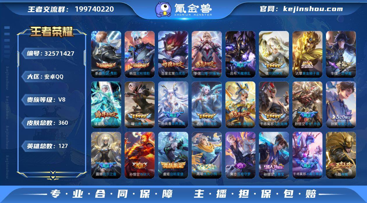 实名: 可修改 性别: 男号 贵族等级: V8 英雄数: 127 皮肤数: 360 荣耀水晶: 鸣剑·曳影,弑枪猎影 传说皮: 黄金狮子座,云鹰飞将,久胜战神,炽阳神光,一念神魔,地狱火,零号·赤焰,游龙清影,挚爱之约,山海·炽霜斩,山海·琳琅生 限定皮: 冰锋战神,李小龙,游园惊梦,梁祝,御风骁将,时雨天司,异界灵契-孙尚香,天狼溯光者,天魔缭乱,神威,蜜橘之夏,奇迹圣诞,青春决赛季,冰霜恋舞曲,天狼运算者,逐梦之影,天狼绘梦者,白虎志,朱雀志,至尊宝,一生所爱,大圣娶亲,默契交锋-花木兰,霸王别姬-虞姬,高山流水,孙行者,傲雪梅枪,启示之音,五谷丰年,山海·玄木吟,山海·碧波行 亮点: 【优质装备】:鸣剑·曳影,弑枪猎影(韩信典藏),黄金狮子座,云鹰飞将(小将军),久胜战神,炽阳神光,一念神魔,地狱火,零号·赤焰,游龙清影(小青龙),挚爱之约,山海·炽霜斩(李信年限),山海·琳琅生(小乔年限)