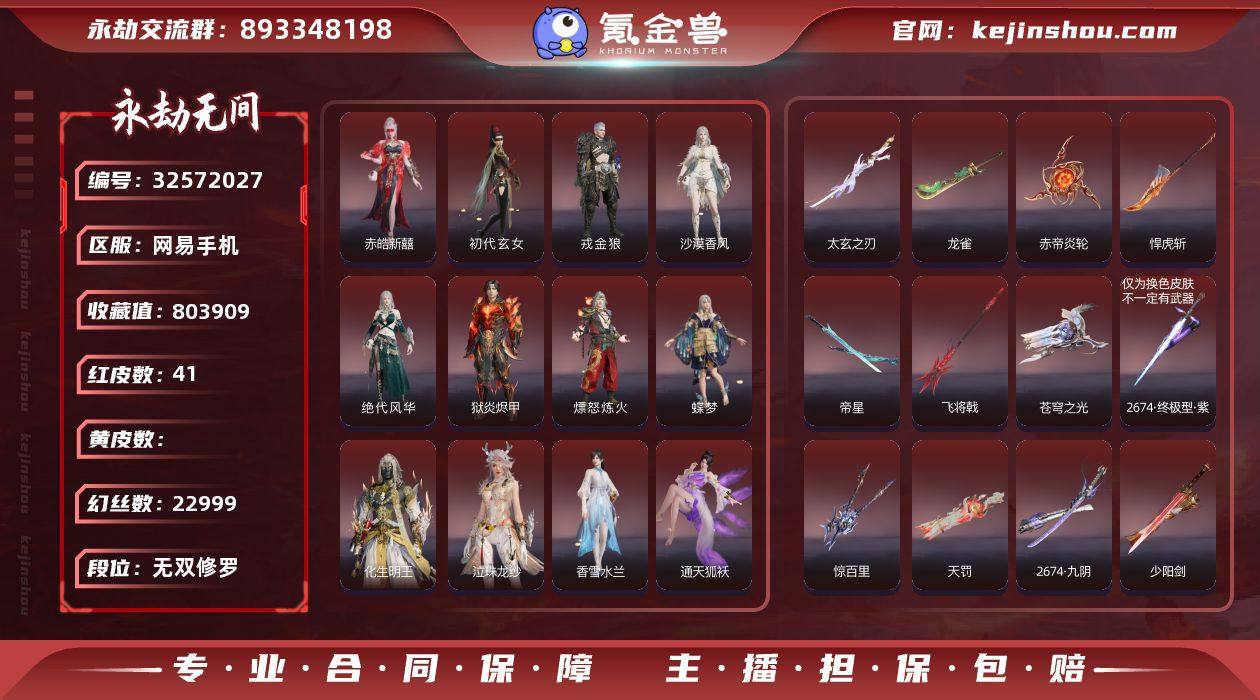 12泳装/咏武战旗【红皮】:墨离(飞索皮肤),初代玄女(宁红叶皮肤),戎金狼(特木尔皮肤),绝代风华(迦南皮肤),沙漠香风(迦南皮肤),熛怒炼火(季沧海皮肤),蝶梦(胡桃皮肤),香雪水兰(顾清寒皮肤),冰魄(长剑皮肤),灵狐幻刃(太刀皮肤),狼主(阔刀皮肤),灵犀(长枪皮肤),毕方(弓箭皮肤),暮光胴丸(武田信忠皮肤),凤求凰(双刀皮肤),烈阳(阔刀皮肤),少阳剑(长剑皮肤),狂龙(双节棍皮肤),化生明王(天海皮肤),泣珠龙纱(崔三娘皮肤),2674·九阴(太刀皮肤),夜魅游莹(季莹莹皮肤),通天狐袄(玉玲珑皮肤),赤皓新囍(宁红夜皮肤),飞将戟(斩马刀皮肤),天罚(火炮皮肤),监兵凶神(胡为皮肤),惊百里(双戟皮肤),2674·终极型·紫(长剑皮肤),守墨麒(张起灵皮肤),星辉魔纱(沈妙皮肤),流金晓锦(刘炼皮肤),苍穹之光(五眼铳皮肤),帝星(横刀皮肤),悍虎斩(斩马刀皮肤),狱炎烬甲(季沧海皮肤),赤帝炎轮(飞刀皮肤),龙雀(阔刀皮肤),太玄之刃(太刀),征天白龙(万钧皮肤),命定之辉(席拉皮肤) 【外观总数】41红 1311金 幻丝:22999金砖: 收藏值:80W 【换绑】:可换绑,期间登录网易大神不影响正常游戏,其他皮肤可参考以下截图,道具、段位以实际验号为准,段位因赛季原因发生变化,以上号为准"