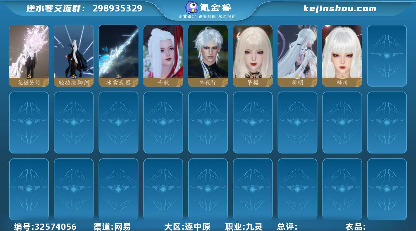 已用天赏石:8 【网易手机账号】 【无换绑冷却】 【九灵】 【女】 【4级】 【凭栏听雨】 【互通】 副本外观1 天赏外观8 副本外观:白夜拂雪; 天赏外观:锦夜行,鳞川,早樱,祈明,千秋,花楹誓约,冰雪武器,轻功诀御剑;