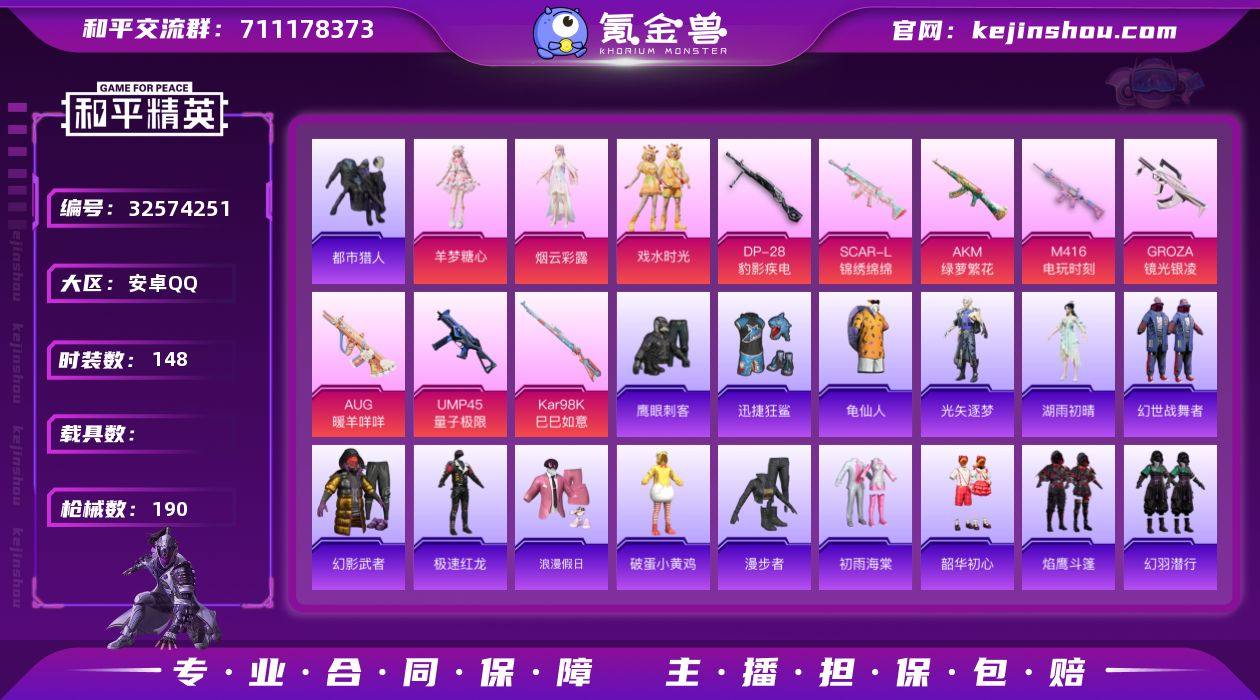 【938501】DYH18094【身法号3粉装-11特效枪 巡查衣服 都市 深海 猫包】安卓手Q-3粉装-11特效枪-148套装-190枪皮-19王牌印记-卓越王牌5星-57410热力值 【3粉装】角色-烟云彩露,戏水时光,角色-羊梦糖心 【11特效枪】M416-电玩时刻[5级],M762-青锋波束[5级],Kar98K-巳巳如意[5级],Mk14-福马献瑞[5级],SCAR-L-锦绣绵绵[5级],ACE32-萌骑漫游[5级],UMP45-量子极限[5级],GROZA-镜光银凌[5级],AKM-绿萝繁花[5级],AUG-暖羊咩咩[5级],DP-28-豹影疾电[5级] 【4稀有】绝对防御上衣(巡查衣),深海小丑鱼,都市猎人,M24-奇异狩猎者,AKM-缤纷海域 【7飞行器】顶峰精英尾迹,空岛之星尾迹,祥瑞锦鲤飞行器,炫彩糖果飞行器,破刃行动尾迹,马上有福飞行器,异域银装飞行器 【1头盔】夏日绵绵冰头盔 【1背包】百万伏特背包 【320其它衣服和枪皮】SS16特训,马上来财,冰冻风暴,异彩先驱,SS37特训,竞技达人朋克,SS34特训,缤纷果语,萌黄之夏,酒红色名流,鹰眼刺客,光之冒险,绒宝小鹅,战地督导,SS18特训,福马献瑞,冷焰舞者,元素星魂,魅力单车,极速红龙,夏日音浪,龙的传人,牛气满满,滨海厨神,恋语绒绒,大橘大利,战术大师,耀粉歌者,蝶变,柠萌假日,智谋强哥,街头潮人,湖畔霞光,漫步者,香桃花海,骑行爱好者,老实...