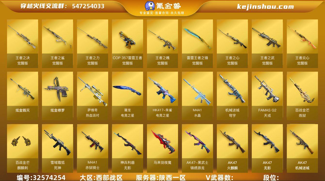 实名: 不可修改 【V武器】 AK47-火麒麟,AK47-无影,AK47-机械迷城,M4A1-雷神,M4A1-黑骑士,M4A1-夜魔,M4A1-千变,M4A1-玫瑰精灵,Barrett-毁灭,Barrett-极光,AWM-天龙,AWM-裁决,M200-幻神,Kar98k-星神,AA-12-雷霆,AK12-天启,HK417-朱雀,QBZ03-金色蔷薇,RPK-盘龙,汤姆逊-烈龙,加特林-炼狱,沙鹰-修罗,沙鹰-天神,屠龙,麒麟刺,擎天,雷神-荣耀世冠,柯尔特-荣耀世冠,柯尔特-竞技荣光,擎天-竞技荣光,Barrett-暗月传说,幻灵之锋,白虎-电玩蓝兔,M14EBR-玄武,破空枪刃-夜魔,龙啸-烈火龙威,AK47-黑武士-锦绣游龙,马来剑-夜魔,无影-神兵利器,死神-雪域霜狐,M4A1-赤狱骑士,M4A1-苍鸣雷神,麒麟刺-百战金芒,炼狱-百战金芒,FAMAS G2-天戎,机械迷城-穹宇,HK417-朱雀-电竞之星,屠龙-电竞之星,萨维奇-热血派对,M4A1-水晶 【王者武器】王者炎心-觉醒版,王者之武-觉醒版,王者之心-觉醒版,雷霆王者之锋-觉醒版,王者之魄-觉醒版,COP 357-雷霆王者-觉醒版,王者之力-觉醒版,王者之鲨-觉醒版,王者之决-觉醒版 【炫金武器】 炫金毁灭,炫金修罗 【热门武器】 C.A.T,COP-旗袍,炼狱-枪娘掣电 【狙击枪稀有皮肤】 毁灭耀金皮肤,毁灭-黑大圣皮肤,M200-幻神-黄忠,幻神-AG-CFPLS17冠军,天龙-能量核心,AWM-...