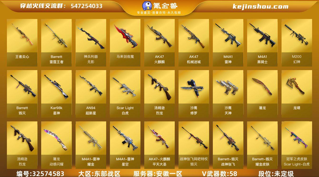 安徽一区-69V-16王者武器数-0炫金武器数 【热门武器】:Scar Light-白虎,M200-幻神,柯尔特-冠军之特,王者炎心,Kar98K-星神,M4A1-黑骑士,汤姆逊-烈龙*6,加特林-炼狱,斯泰尔-蝴蝶,沙鹰-修罗*5 【王者炫金武器】:王者炎心,Barrett-雷霆王者,高爆手雷-雷霆王者*2,烟雾弹-雷霆王者 【音效卡】:AK47-火麒麟音效卡,M4A1-雷神音效卡,M4A1-黑骑士音效卡,Barrett-毁灭音效卡,Scar Light-白虎音效卡,Kar98K-星神音效卡,Barrett-碧霄极光音效卡*2,炼狱-百战金芒-庆典舞曲音效卡 【皮肤】:幻神-冠军之幻,ScarLight-白虎-冠军之虎皮肤,雷神-星空,雷神-耀金皮肤,M4A1-再燃火线,火麒麟-平天大圣,火麒麟-百城,火麒麟-心动糖果,毁灭耀金皮肤,毁灭-战神张飞,HK417-朱雀-武当,轻型军用手斧-再燃火线 【角色】:零·纪元,战地猎狐,王者潘多拉,葵-阿尔法武装,幻面灵狐,初恋灵狐,芳心审判者,风暴女,虎妞,嘉年华灵狐,灵狐-花神,灵狐者-X,灵狐者-职业经理,龙儿,麻雀,潘多拉-X,潘多拉-甜心教官,斯沃特-X,铁骑荣耀,雪莉杨-摸金校尉,樱-战斗天使,幽,潘多拉-N 【人偶武器】:迷你宝贝,斯泰尔-蝴蝶,迷你深渊冰龙,迷你裂空之翼*4,迷你波特博士*3,...