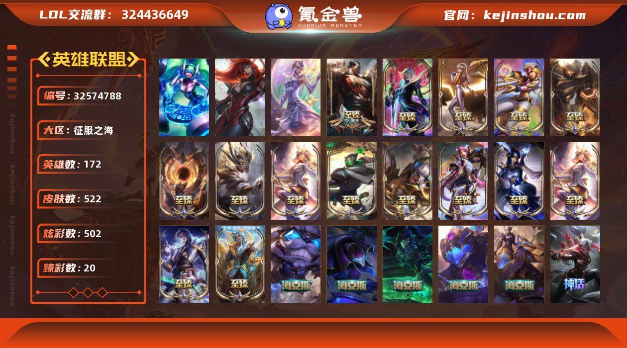 t38265【征服之海】522皮肤 502炫彩 20臻彩 27神话/69限定/53传说/172英雄 账号等级:1313【重要头像】爱情鸽 心型钥匙 觅心之翼奎因 大家伙 EDG佛耶戈 北极星神黛安娜炫彩 沐浴震惊 绝息圣堂洛 魄罗虎虎生威 招财进宝提莫 招财进宝提莫炫彩 不错哦 至臻幻灵战斗猫金克丝 至臻星之守护者索拉卡 至臻魔女婕拉 水晶圣骑蕾欧娜炫彩头 水晶圣骑蕾欧娜头 灰烬慎头像 灰烬慎炫彩头 【重要皮肤】机神玄武盖伦至臻 凯旋将军德莱厄斯至臻 至高天凯尔至臻 天龙之子伊泽瑞尔至臻 心之钢永恩至臻 青花瓷丽桑卓至臻 幻灵战斗猫金克丝至臻 魔女婕拉至臻 星之守护者索拉卡至臻 暗星墨菲特至臻 神龙尊者炎龙瑟提至臻 征服者贾克斯至臻 KDA一代卡莎至臻 电玩女神凯特琳至臻 殿堂传奇薇恩 超级COSPLAY粉丝妮蔻 灰烬守护者慎 海克斯科技瑟庄妮 海克斯科技吉格斯 海克斯科技拉莫斯 海克斯科技魔腾 水晶泰坦诺提勒斯 水晶圣骑蕾欧娜 摄魂使者薇恩 胜利行刑官德莱文 胜利女神娑娜 胜利之王泰达米尔 创星之灵璐璐 荣誉使者玛尔扎哈 养蜂人辛吉德 星之守护者伊泽瑞尔 女帝厄运小姐 玉剑传说无劫 玉剑传说舞龙卫 点心宝贝阿木木 天龙之子斯莫德...
