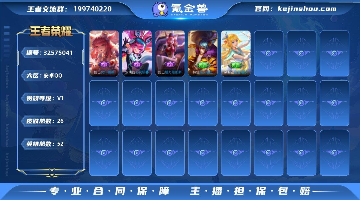 实名: 可修改 贵族等级: V1 英雄数: 52 皮肤数: 26