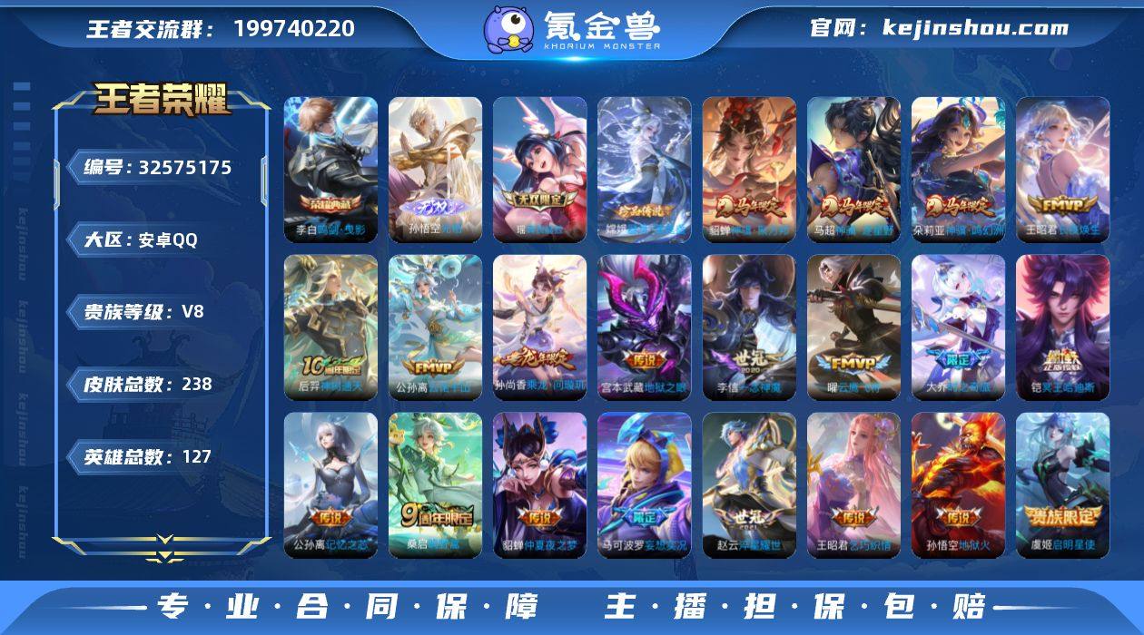贵族8-238皮-1典藏-2无双-1珍品传说-21传说-4全皮英雄-2改名卡-1灵宝改名卡 安卓手Q357区 营地ID1662941583最强王者【珍品传说皮肤】:器灵·落星盏【无双皮肤】:瑶真我赫兹,无相【荣耀典藏】:鸣剑·曳影【传说皮肤】:淬星耀世,启明星使,灼幽烈阳,神骥·鸣幻洲,神骥·逐星野,神骥·聚万邦,地狱之眼,长夜焕生,云诺千山,时之奇旅,神树通天,地狱火,鸣野蒿,妄想实况,乞巧织情,记忆之芯,冥王哈迪斯,乘龙·问璇玑,一念神魔,仲夏夜之梦,云鹰飞将【史诗皮肤】:春霖将至,镜真我赫兹,浮梦罗烟,瓦猫非猫,灵蛊蚀心,幽灵船长,无心,线条小狗,九幽镇关,紫霞仙子,罗小黑战记,巫礼祀神,地狱岩魂,万灵启世,光弋星穹,龙之律动,织梦人,百相守梦,妄想食味,特工魅影,偶像歌手,石田雨龙,摇滚巨星,电玩小子,顽趣,星界战将,化蝶舞,圣诞狂欢,高山流水,青蛇,破空之剑,陌上桑,鬼剑武藏,星界特工,遇见神鹿,乘风破浪,月团寄思,猫狗日记,顽岩魄,滕王阁序,夏日便利店,水晶猎龙者,荣光圣徽,孙行者,曙光守护者,逐浪之夏,魅语,女仆咖啡,黄金分割率,琥珀纪元,永昼,地狱燃心,乱世虎臣,星夜王子,江河有灵,魔术师,驭风魔法,金属风暴,百里守约真我赫兹,电玩·爆裂旋风,星界游侠,猫狗日记,山海·玄木吟,水果甜心,五谷丰年,皇...