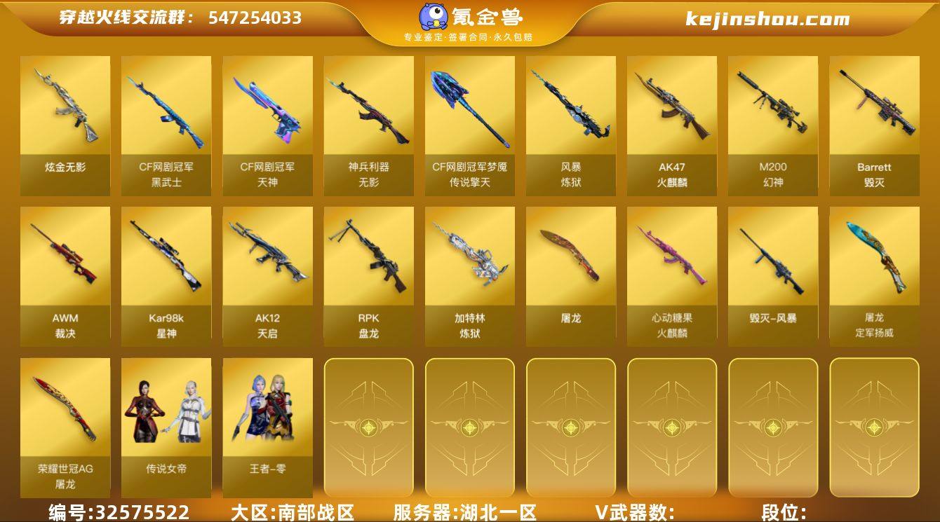 湖北一区,等级100,炫金武器1,V武器20, 【英雄角色】传说女帝,樱,王者-零, 【V武器】M200-幻神,Kar98K-星神,Barrett-毁灭,AWM-裁决,RPK-盘龙,加特林-炼狱,炼狱-风暴,AK47-火麒麟,AK12-天启,黑武士-CF网剧冠军,无影-神兵利器,天神-CF网剧冠军,屠龙,擎天-CF网剧冠军, 【狙击枪稀有皮肤】毁灭-风暴, 【步枪稀有皮肤】火麒麟-心动糖果, 【副武器稀有皮肤】修罗-能量核心, 【近身武器稀有皮肤】屠龙-荣耀世冠AG,屠龙-定军扬威 皮肤, 【小人枪】魔能飞环-曼陀罗,迷你生化手雷,AWM-灵狐-15周年嘉年华,天龙-曼陀罗,M4A1-雷神-精英刀锋,生化手雷-机甲核心,迷你深渊冰龙,斯泰尔-蝴蝶,闪光弹-貂蝉, 【武器】死亡之眼,魂·炼狱-玩具枪,源·龙啸,源-金色蔷薇,G36C-宇航兔兔,凤凰之息, 【挑战大师】荣耀之证-荣耀之巅, 【炫金武器】炫金无影,