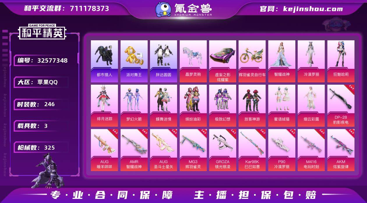【女号战神框巡查衣小丑女金鞋都市猎人小番茄LED眼罩12特效枪11粉装3载具 秒换绑不用等】 苹果Q区-107911热力值-历史最高段位:无敌战神-246套装-325枪皮 【3载具】 虚妄之影(炫耀紫) 晶梦灵驹 辉羽雀灵自行车【8稀有】 都市猎人 派对舞王(金靴子) 巡查衣 红熊茄茄(权威小潘茄) 放客神游眼镜LED眼罩 胖达圆圆卤蛋头 濡粉咩咩 红眼罩【11粉装】 放客神游 狂魅哈莉(小丑女) 梦幻火箭 缤纷油彩(猪脸妹) 蜜语绒猫 极致幻想 蝶舞迷情 角色-冷漠罗丽 角色-智耀战神 角色-烟云彩露 角色-绯月迷踪【12特效枪】 MG3-辉羽雀灵(3级) AKM-炫紫旋律(6级) Mk14-福马献瑞(5级) SCAR-L-锦绣绵绵(5级) AMR-智耀战神(5级) AUG-圣斗士星矢(6级) Kar98K-巳巳如意(5级) P90-冷漠罗丽(7级) AUG-暖羊咩咩(5级) M416-电玩时刻(5级) GROZA-镜光银凌(5级) DP-28-豹影疾电(5级)【316热门】 胖达圆圆 暗夜契约(假黑丝) 暗影哥特(红眼罩) 浪漫天命 都市猎人(蓝口罩) 潮萌小黄鸭 激萌罗小黑 小丑鱼 极速红龙 团圆交子 瑞龙福将 纯白誓言 狂沙舞者 冰公主 缤纷焰火 白色伏地魔 SS27特训 SS26特训 SS25特训 SS24特训 SS23特训 SS22特训 M24-歌者泠鸢 AWM-雷霆特警 SCAR-L-玉兔迎春 GROZA-田园牧歌 M76...