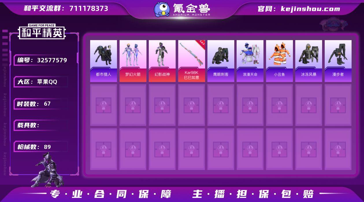 DSH2417【身法 2粉装-3特效枪 暗影哥特,都市猎人,小丑鱼,浪漫天命】苹果手Q-2粉装-3特效枪-67套装-89枪皮-5王牌印记-超级王牌2星-23654热力值 【2粉装】幻影战神,梦幻火箭 【3特效枪】Mk14-福马献瑞[4级],Kar98K-巳巳如意[5级],UMP45-萌骑冒险[4级] 【4稀有】暗影哥特,都市猎人,小丑鱼,浪漫天命 【2飞行器】顶峰精英尾迹,马上有福飞行器 【2头盔】梦幻火箭头盔,幻影战神头盔 【3背包】幻影战神背包,萌熊伴侣背包,梦幻火箭背包 【147其它衣服和枪皮】星途旅人,角色-X,琴音绮想,红釉青花,SS30特训,雨过天青,SS25特训,深蓝色名流,红色运动,果汁能量,青翼流星,SS31特训,吉莉礼服,黄色运动,白色伏地魔,萌趣咩咩,SS21特训,福马献瑞,竞技达人朋克,军械专家,巳巳如意,画境星梦,旭日情侣,娇憨猪猪,冰冻风暴,竞技名士,雪鹰学院,墨染幽兰,SS37特训,老实芭蕉,马上有钱,SS22特训,街头潮人,冰川特警,清新柠檬,鹰眼刺客,魅力单车,绮丽涂鸦,光之冒险,龙的传人,麻辣教官,特训学院,漫步者,冷焰舞者,SS28特训,狙击之神,战术大师,龙魂突击队,SS36特训,海岛探路者,冰河战士,恋语绒绒,街头风暴,鹤鸣,长空猛禽,SS29特训,甜蜜菠萝,幻影武者,潮流炫酷,蝶变,书海巡游,MG3-幻世战舞者,PKM-啾咪啾咪,Mk47-...