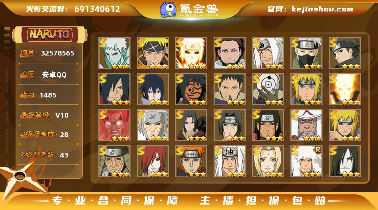 【精品性价比决斗场忍者号】s2189 战力1485w 本服89 28s 43a 1个98通灵 1个298a 2个198a 26忍法帖已开 月卡已开 1个组织时装 博人传主场景 创立柱间80片 秽土三代风影36片 忍战大野木96片