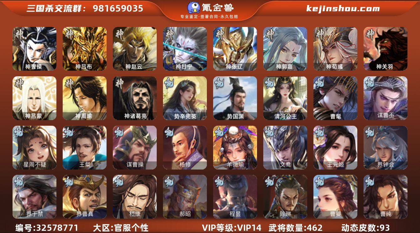 官阶:大将军;VIP等级:VIP14;史诗武将数量:82;动态皮肤数量:93;武将总数:462;史诗宝珠数量:2;将魂数量:24754;神将:8;魏国史诗武将:49;蜀国史诗武将:15;吴国史诗武将:13;群史诗武将:29 神曹操,神吕布,神赵云,神甘宁,神张辽,神郭嘉,神荀彧,神诸葛亮,曹髦,星周不疑,王粲,谋曹操,杨修,羊徽瑜,王元姬,界钟会,界于禁,界曹真,嵇康,郝昭,陈琳,曹婴,曹纯,戏志才,谋曹丕,清河公主,势国渊,势辛宪英,程昱,关索,马云騄,谋黄忠,谋赵云,谋马超,诸葛瞻,周群,赵襄,张星彩,王平,沙摩柯,谯周,花鬘,谋关羽,势魏延,谋黄盖,周处,吴景,孙皓,骆统,留赞,界徐盛,贺齐,势陆郁生,文鸯,谋孙尚香,裴秀,界沮授,皇甫嵩,左慈,郑玄,张让,星黄忠,星甘宁,王允,陶谦,苏飞,麹义,庞德公,祢衡,刘焉,沮授,界左慈,界李儒,公孙康,杜预,卑弥呼,谋张角,许攸,势于吉,星董卓,兀突骨,士燮,司马昭,神吕蒙,神周瑜,神关羽,势夏侯尚,SP关羽,SP曹仁,SP蔡文姬,乐进,曹昂,诸葛诞,朱灵,文聘,SP姜维,张春华,钟会,曹冲,郭淮,满宠,界王异,界曹操,界司马懿,界夏侯惇,界张辽,界许褚,界郭嘉,李典,曹真,韩浩史涣,陈群,曹叡,曹休,钟繇,司马朗,王基,李通,郭皇后,孙资刘放,辛宪英,界甄姬,吕虔,鲁芝,蒯越蒯良,界典韦,界荀彧,界徐晃,杜畿,...