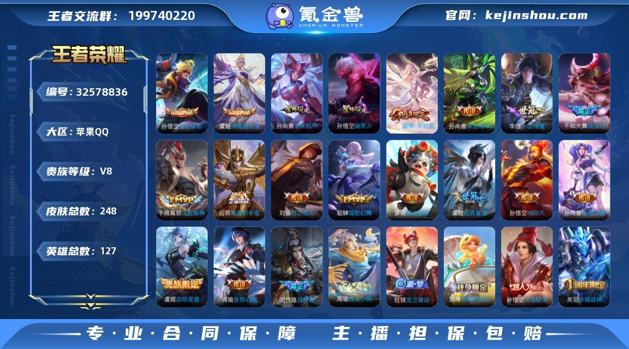 S-FJ7823 苹果QQ V8 248皮 2典藏2星元 65限定14传说 3按键1天幕 11张改名卡 332星币 营地号:326829804 【荣耀典藏】全息碎影,神鉴启示录, 【星元皮肤】幽冥火,未来机甲, 【热门限定】愿照·岁时盈,乘龙·聚宝船,冰锋战神,逐梦之光,大圣娶亲,绯月行,山海·碧波行,启明星使,唐三藏,匿光启智者, 【限定传说】拒霜思,猫狗日记男,久胜战神,一念神魔,猫狗日记女,电玩小子,猫影幻舞,地狱火,暗夜猫娘,时之恋人男,龙骑士,未来纪元,音你心动男,云霓雀翎,黄金射手座,黄金分割率,超时空战士,音你闪耀,魅语,胖达荣荣,千年之狐,末日机甲男,末日机甲女,原初探秘者,暗隐猎兽者,水晶猎龙者,金属风暴,地狱岩魂,圣诞恋歌,青蛇,舞动绿茵,逐浪之夏,心灵战警,紫霞仙子,幽灵船长,乘风破浪,星夜王子,节奏热浪,暗夜贵公子,偶像歌手,街头霸王,箭羽风息,摇滚巨星,缤纷独角兽,猎兽之王,死神来了,冰冠公主,狂想玩偶喵,单词大作战,花好人间,饕餮,穷奇,御狮,御霄,御銮,朔风刀,醍醐杖,万华元夜,如懿,拳王,女仆咖啡,丁香结,科学大爆炸,