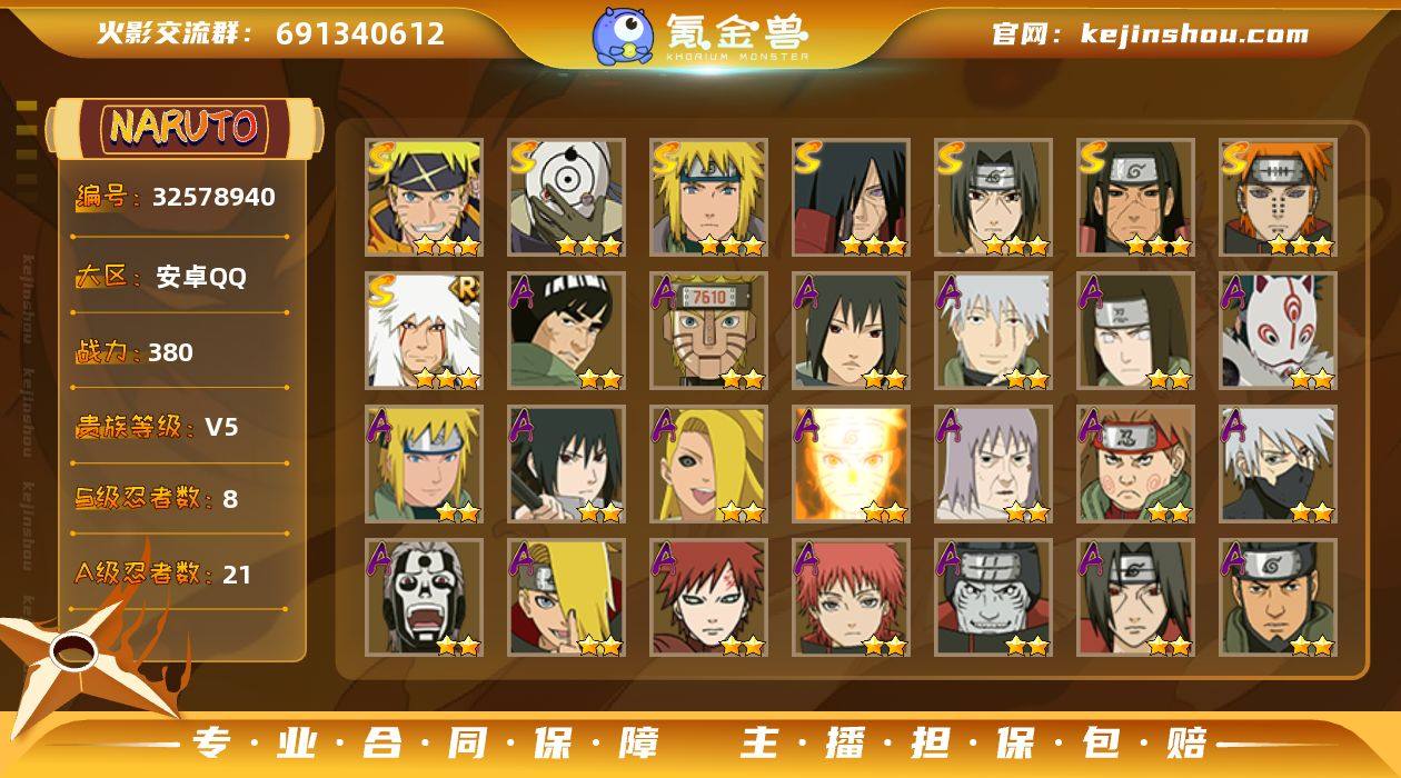 8S级忍者数-21A级忍者数 【S级忍者】:千手柱间「秽土转生」(3星),宇智波斑「秽土转生」(3星),宇智波鼬「须佐能乎」(3星),自来也「舞之豪杰」(3星),波风水门(3星),佩恩「天道」(3星),宇智波斑 「白面具」(3星宇智波斑「白面具」),漩涡鸣人·宇智波佐助(3星) 【A级忍者】:波风水门「青年」(2星),迪达拉(2星),迪达拉「秽土转生」(2星),飞段「死司凭血」(2星),干柿鬼鲛(2星),漩涡鸣人「九尾查克拉」(2星),机械鸣人「初始形态」(2星),迈特凯(2星),旗木卡卡西「万花筒写轮眼」(2星),旗木卡卡西「幻之真容」(2星),我爱罗「疾风传」(2星),蝎(2星),猿飞阿斯玛(2星),宇智波鼬(2星),宇智波佐助「须佐能乎」(2星),日向宁次「忍界大战」(2星),神秘面具男「忍者之路」(2星),秋道丁次「忍界大战」(2星),千代「近松十人卫」(2星),宇智波泉奈(2星),迈特凯「青春爆炸」(2星)