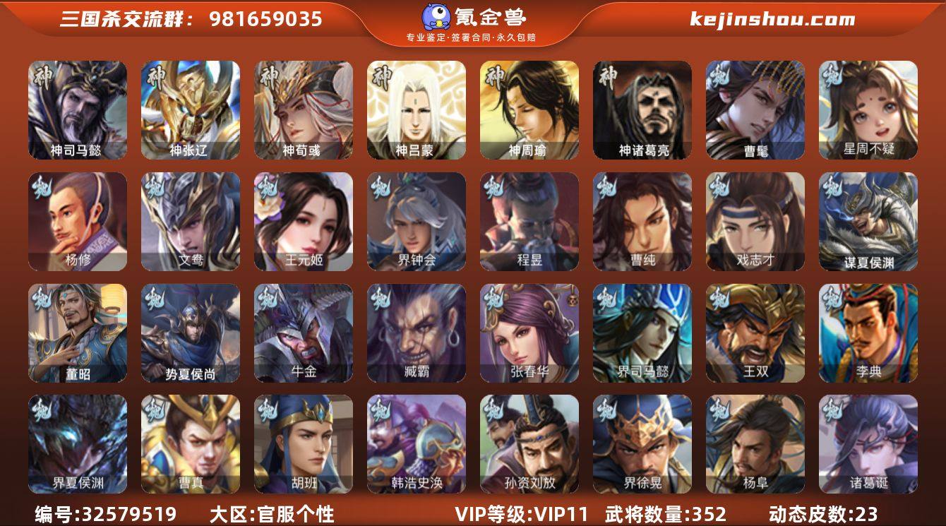 官阶:大将军;VIP等级:VIP11;史诗武将数量:33;动态皮肤数量:23;武将总数:352;史诗宝珠数量:5;将魂数量:7111;神将:4;魏国史诗武将:15;蜀国史诗武将:5;吴国史诗武将:8;群史诗武将:10 神司马懿,神张辽,神荀彧,神诸葛亮,曹髦,星周不疑,杨修,王元姬,界钟会,曹纯,戏志才,程昱,势钟会,谋赵云,谯周,花鬘,董允,谋关羽,张奋,周处,留赞,界朱然,界徐盛,贺齐,文鸯,谋公孙瓒,左慈,杨彪,麹义,南华老仙,沮授,谋张角,兀突骨,司马昭,神吕蒙,神周瑜,势夏侯尚,SP关羽,SP曹仁,SP蔡文姬,乐进,曹昂,诸葛诞,朱灵,文聘,SP姜维,张春华,钟会,曹冲,郭淮,满宠,界王异,界曹操,界司马懿,界夏侯惇,界张辽,界许褚,界郭嘉,李典,曹真,韩浩史涣,陈群,曹叡,曹休,钟繇,司马朗,王基,李通,郭皇后,孙资刘放,辛宪英,吕虔,鲁芝,蒯越蒯良,界典韦,界荀彧,界徐晃,杜畿,界曹丕,界邓艾,张恭,界曹植,界满宠,界郭淮,华歆,蔡贞姬,王双,崔琰,杨阜,阮慧,谋于禁,界曹休,牵招,胡班,司马孚,谋夏侯渊,牛金,界夏侯渊,臧霸,董昭,势陈到,SP孙尚香,关银屏,夏侯霸,马良,关兴张苞,廖化,界马岱,关平,简雍,刘封,界法正,界关兴张苞,界刘备,界关羽,界张飞,界赵云,界马超,SP徐庶,吴懿,周仓,张松,刘谌,夏侯氏,糜竺,马忠,李严,黄皓,界黄月英...