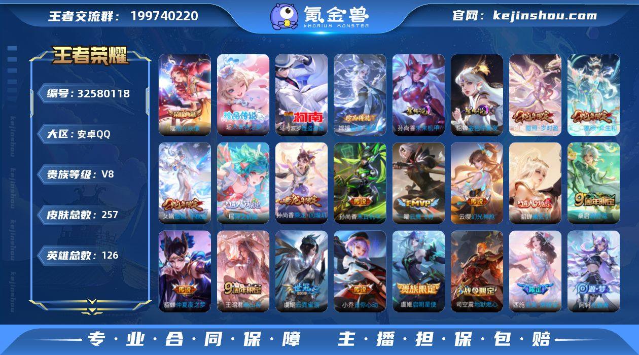 【漂亮V8女号瑶典藏瑶嫦娥马可珍品15个高质量传说14个个性按键】安卓Q-V8-永恒钻石V段位-126英雄-257皮肤-1典藏皮肤-3珍品传说-15传说-67史诗【荣耀典藏】:瑶拾光映像【珍品传说】:瑶大耳狗之梦,嫦娥器灵落星盏,马可波罗怪盗基德【传说皮肤】:女娲愿照千秋盛,妲己愿照众生和,虞姬愿照岁时盈,云缨幻光神枪,王昭君映山客,桑启鸣野蒿,貂蝉曦玄引,孙尚香乘龙问璇玑,瑶时之祈愿,小乔音你心动,虞姬启明星使,曜云鹰飞将,虞姬云霓雀翎,貂蝉仲夏夜之梦,孙尚香末日机甲【限定皮肤】:白起狰,蔡文姬夏日便利店,大乔绒语心约,虞姬夏日便利店,姜子牙天穹之誓,狄仁杰阴阳师,小乔纯白花嫁,虞姬凯尔特女王,赵云皇家上将,妲己时之彼端,妲己时之奇旅,孙尚香蔷薇恋人,阿轲迷踪丽影,孙膑妖精王,白起夜都怪侠,芈月重明,元歌无心,夏侯惇朔风刀,甄姬游园惊梦,曹操烛龙,典韦穷奇,狄仁杰魔术师,狄仁杰万华元夜,达摩沙漠行僧,项羽海滩派对,老夫子醍醐杖,程咬金演武夺筹,王昭君午后时光,兰陵王金庭之子,牛魔御旌,李元芳银河之约,李元芳云中旅人,虞姬启明星使,钟馗驱傩正仪,杨玉环遇见飞天,干将莫邪胡桃夹子,蔡文姬繁星吟游,太乙真人饕餮,鬼谷子...