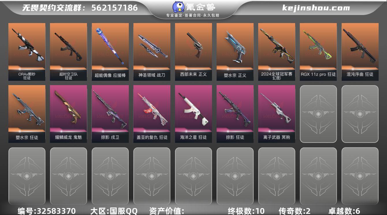 【Hww649】国服Q区 可二次 皮肤价值28010【橙皮2金皮10紫皮6皮肤50英雄28卡面107已用源晶1005】未定级 优质皮肤:影钩,2024全球冠军赛,正义-塑水宗 【英雄】:幻棱,炼狱,维斯,暮蝶,钛狐,壹决,铁臂,捷风,雷兹,幽影,不死鸟,贤者,猎枭,蝰蛇,零,芮娜,奇乐,尚勃勒,霓虹,斯凯,夜露,星礈,K/O,海神,盖可,黑梦,钢锁 【近战武器】:近战武器-影钩,近战武器-超能偶像 应援棒,近战武器-盖亚之愠,近战武器-神圣领域 战刀 【狂徒】:狂徒-混沌序曲,狂徒-塑水宗,狂徒-RGX 11z Pro,狂徒-ORA x 颗秒,狂徒-超时空卫队,狂徒-掠影,狂徒-盖亚的复仇,狂徒-海洋之星,狂徒-超能偶像 【幻影】:幻影-2024全球冠军赛,幻影-神圣领域,幻影-聚合之力 【戍卫】:戍卫-掠影,戍卫-超能偶像,戍卫-月球哨兵 【獠犬】:獠犬-神圣领域,獠犬-采蜜小蜂队 【冥驹】:冥驹-离子武器,冥驹-星云暗涌 【飞将】:飞将-聚合之力 【莽侠】:莽侠-月球哨兵 【战神】:战神-神圣领域,战神-采蜜小蜂队 【判官】:判官-超能偶像,判官-采蜜小蜂队 【雄鹿】:雄鹿-月球哨兵 【骇灵】:骇灵-星云暗涌 【蜂刺】:蜂刺-聚合之力,蜂刺-星云暗涌 【标配】:标配-超能偶像 【正义】:正...