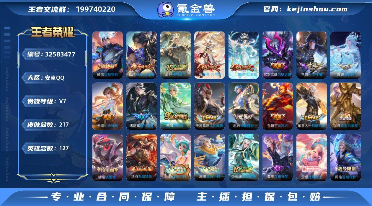 【Hwz895】【精品男号】安卓Q-V7-可二次-4银标-17铜标-127英雄-217皮肤-1典藏皮肤-15传说-60史诗(弑枪猎影、神骥逐星野、愿照九州拓、鹤羽星尊、霜月吟、至尊宝) 【英雄全皮】:苍全皮,敖隐全皮,空空儿全皮 【荣耀典藏】:韩信弑枪猎影 【传说皮肤】:马超神骥逐星野,后羿神树通天,妲己愿照众生和,澜愿照九州拓,云缨幻光神枪,桑启鸣野蒿,露娜霜月吟,东皇太一灼幽烈阳,诸葛亮鹤羽星尊,赵云淬星耀世,李信一念神魔,张良黄金白羊座,干将莫邪久胜战神,宫本武藏地狱之眼,孙悟空地狱火 【限定皮肤】:狄仁杰阴阳师,赵云皇家上将,赵云百木心枪,墨子神迹守卫,墨子降魔,庄周高山流水,高渐离玩趣恶龙,元歌无心,马可波罗山海玄木吟,狄仁杰魔术师,项羽海滩派对,孙悟空至尊宝,诸葛亮鹤羽星尊,裴擒虎李小龙,鲁班大师探海日志,阿古朵江河有灵,张良古海寻踪,妲己灵卜魔法,鬼谷子天穹祈灯,沈梦溪龙舞盛年,刘邦剑破天穹,程咬金群星魔术团,项羽苍威无极 【年限皮肤】:马可波罗山海玄木吟,妲己愿照众生和,澜愿照九州拓 【赛季限定】:鲁班大师探海日志,张良古海寻踪,鬼谷子天穹祈灯,刘邦剑破天穹,东皇太一噬灭天穹,太乙真人谧流熔炉,钟馗虚灵犬护...