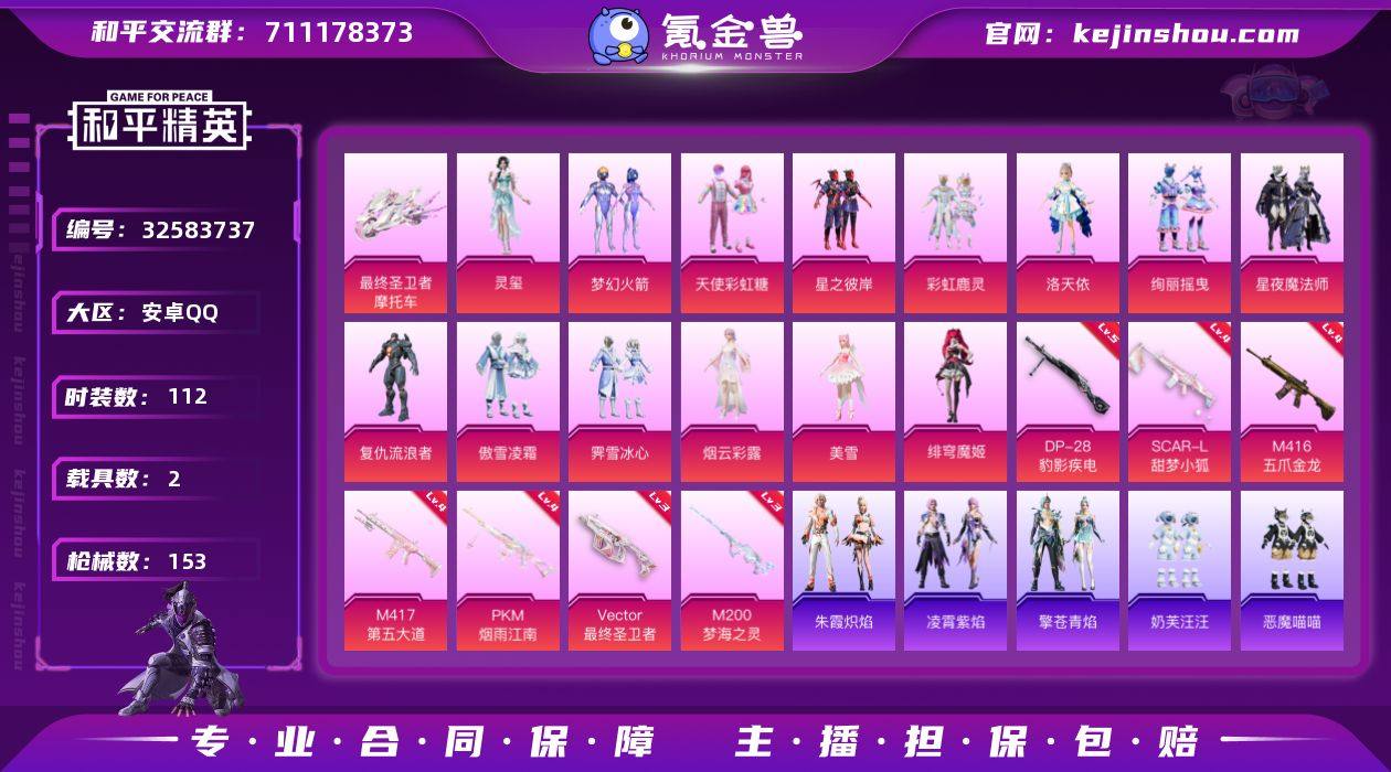 LK2632114 无二次安卓 手Q-1神装-14粉装-9特效枪-2载具-9粉色飞行器-57687热力值-1王牌印记-112套装-153枪皮 【红色神装等级】:暮色玫影-艾丽娅(二级) 【红色角色神装】:暮色玫影-艾丽娅 【热门品类】:粉装-梦幻火箭 【粉色套装】:粉装-天使彩虹糖,粉装-梦幻火箭,粉装-星之彼岸,粉装-彩虹鹿灵,角色-洛天依,粉装-绚丽摇曳,粉装-星夜魔法师,角色-复仇流浪者,粉装-傲雪凌霜,粉装-霁雪冰心,角色-烟云彩露,角色-美雪,角色-绯穹魔姬,角色-灵玺 【粉色枪皮等级】:SCAR-L-甜梦小狐(四级),M416-五爪金龙(四级),Vector-最终圣卫者(三级),AKS-74U-森灵之息(三级),Mk14-福马献瑞(五级),M417-第五大道(四级),M200-梦海之灵(三级),DP-28-豹影疾电(五级),PKM-江南烟雨(四级) 【粉色载具】:最终圣卫者摩托车,暮色幽蹄 【粉色枪皮】:SCAR-L-甜梦小狐,M416-五爪金龙,Vector-最终圣卫者,AKS-74U-森灵之息,Mk14-福马献瑞,M417-第五大道,M200-梦海之灵,DP-28-豹影疾电,PKM-江南烟雨 【粉色飞行器】:香车宝马飞行器,星夜魔法师飞行翼,萌物绒绒飞行器,镜域双华-灵镜之阶,幻海精灵飞行器,曦光华影飞行器,终晖之翼飞行器,暮色之舞飞行器 【粉色降落伞】:...