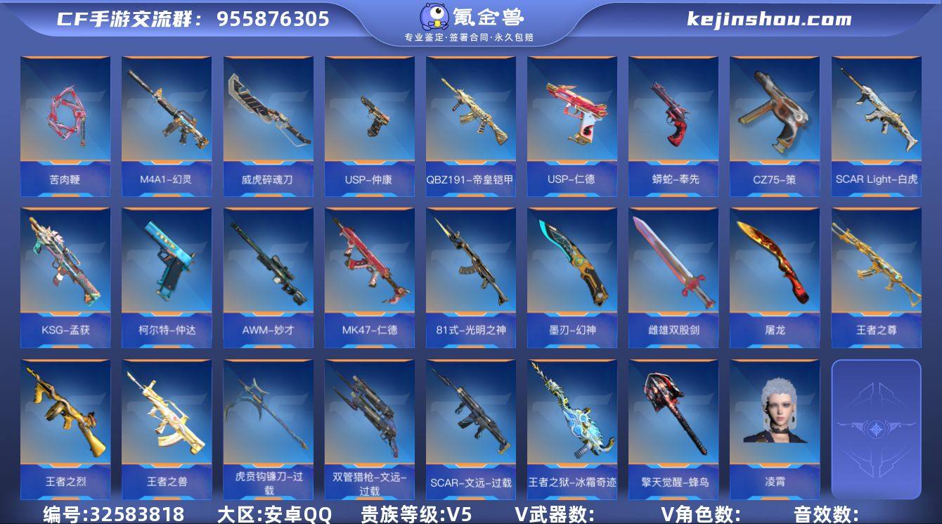 ✨极品入坑小号!9王者武器 2王者雷 妙才+仁德+过载文远套+孟获+帝皇铠甲+王尊+7屠龙+凌霄+狙击枪线诸神黄昏✨『250V-显血戒-VIP5-129级』 【王者武器】:/王者之尊/王者之兽/王者之狱-冰霜奇迹/王者之烈/ 【热门武器】:/AWM-妙才/MK47-仁德/SCAR-文远-过载/KSG-孟获/M4A1-幻灵/SCAR Light-白虎/81式-光明之神/QBZ191-帝皇铠甲/ 【副武器】:/双管猎枪-文远-过载/USP-仲康/柯尔特-仲达/USP-仁德/CZ75-策/蟒蛇-奉先/ 【近战】:/虎贲钩镰刀-过载/雌雄双股剑/擎天觉醒-蜂鸟/威虎碎魂刀/激昂霸王枪/苦肉鞭/墨刃-幻神/屠龙*7/ 【角色】:/凌霄/ 【其他】:/1语音卡/10音效卡/1消灭音效/狙击枪线(诸神黄昏)/
